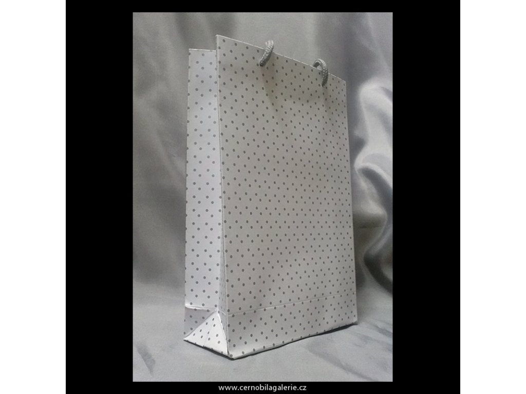 Bílá papírová dárková taška se vzorem šedých puntíků, jednoduché pro balení mensších dárků např. knih.