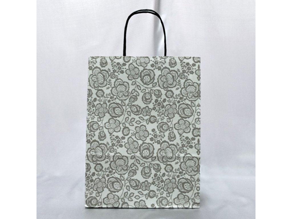 Papírová dárková taška v šedobílém provedení s decentním květinovým vzorem.