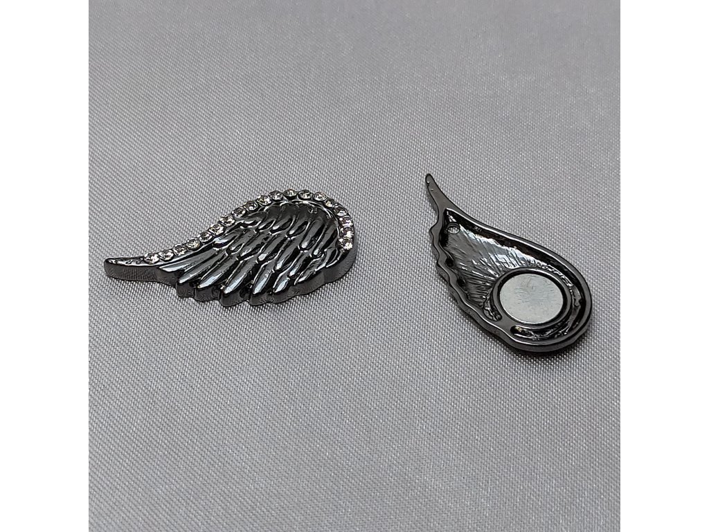 Něžná, menší magnetická brož ve tvaru andělského křídla, která slouží jako symbolický talisman.