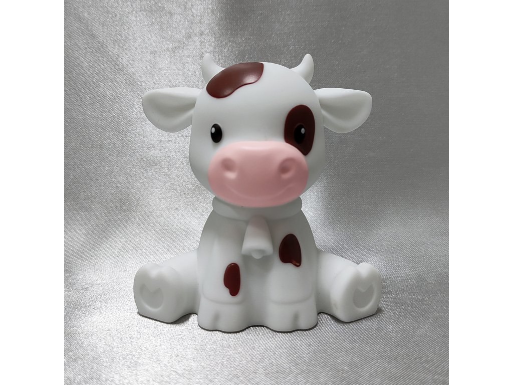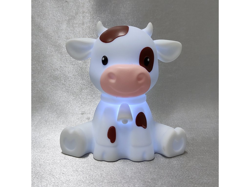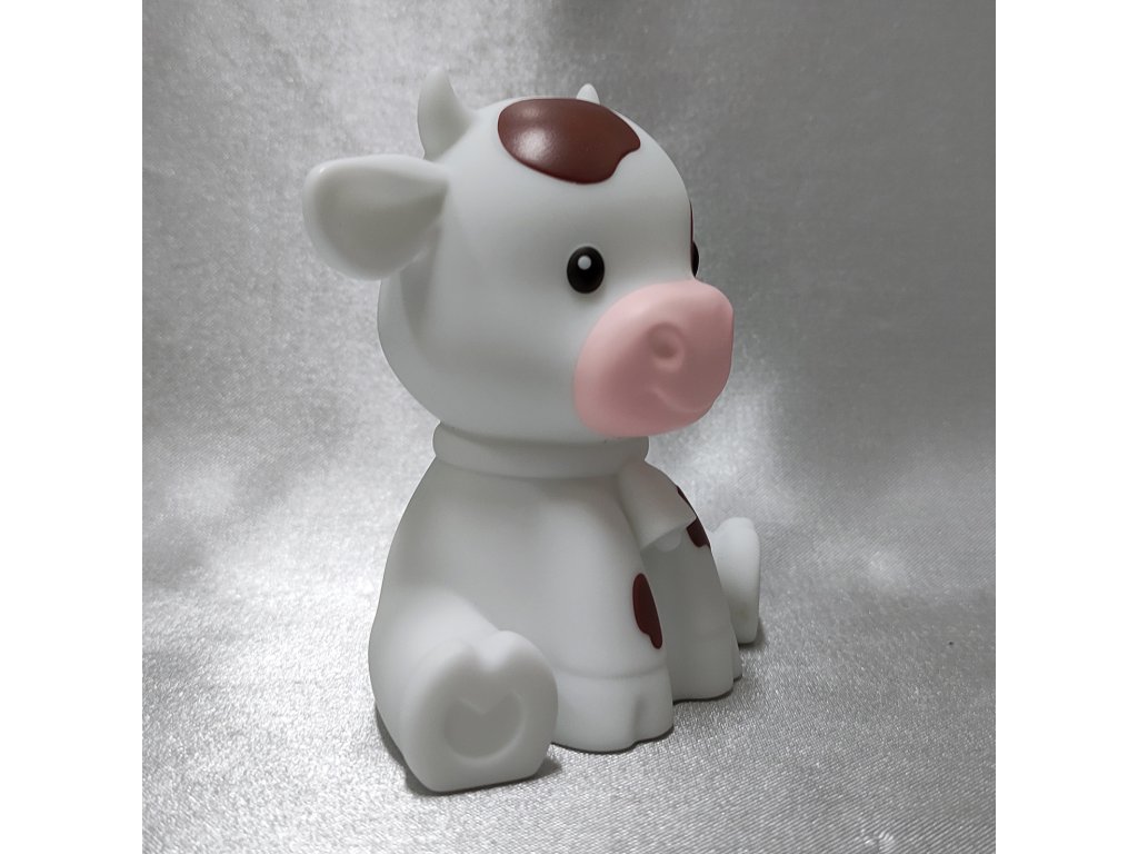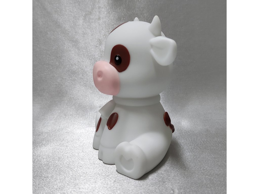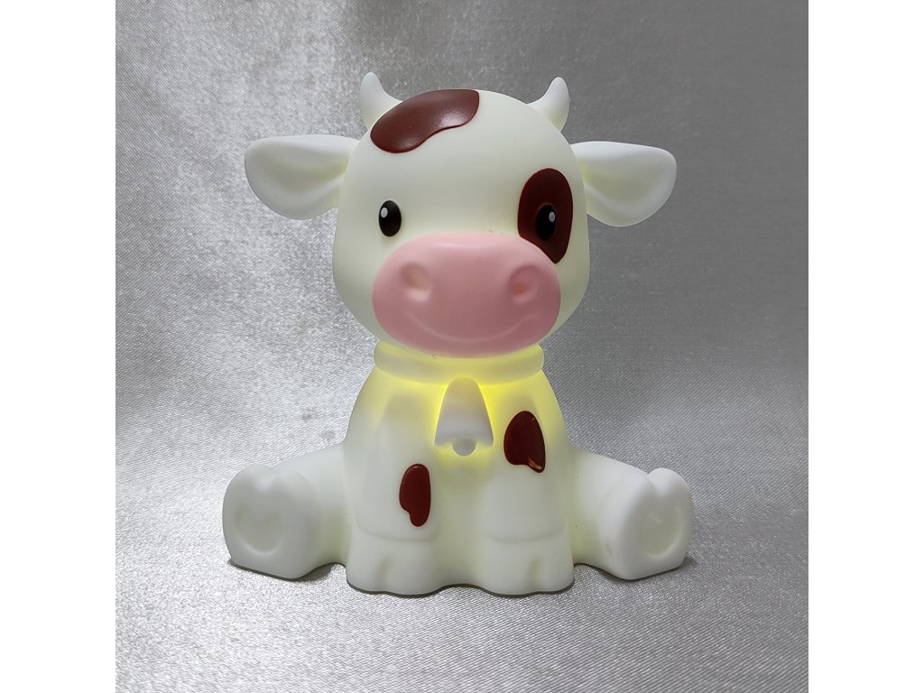 Hravé LED noční světýlko ve tvaru bílého telátky s hnědými flíčky.