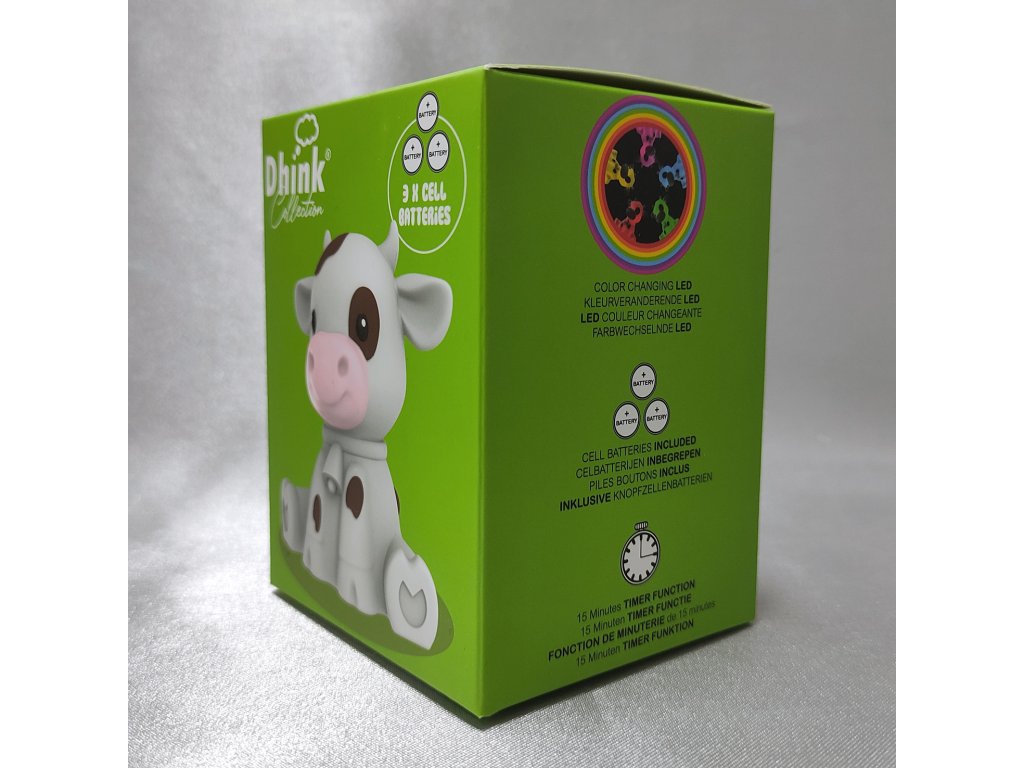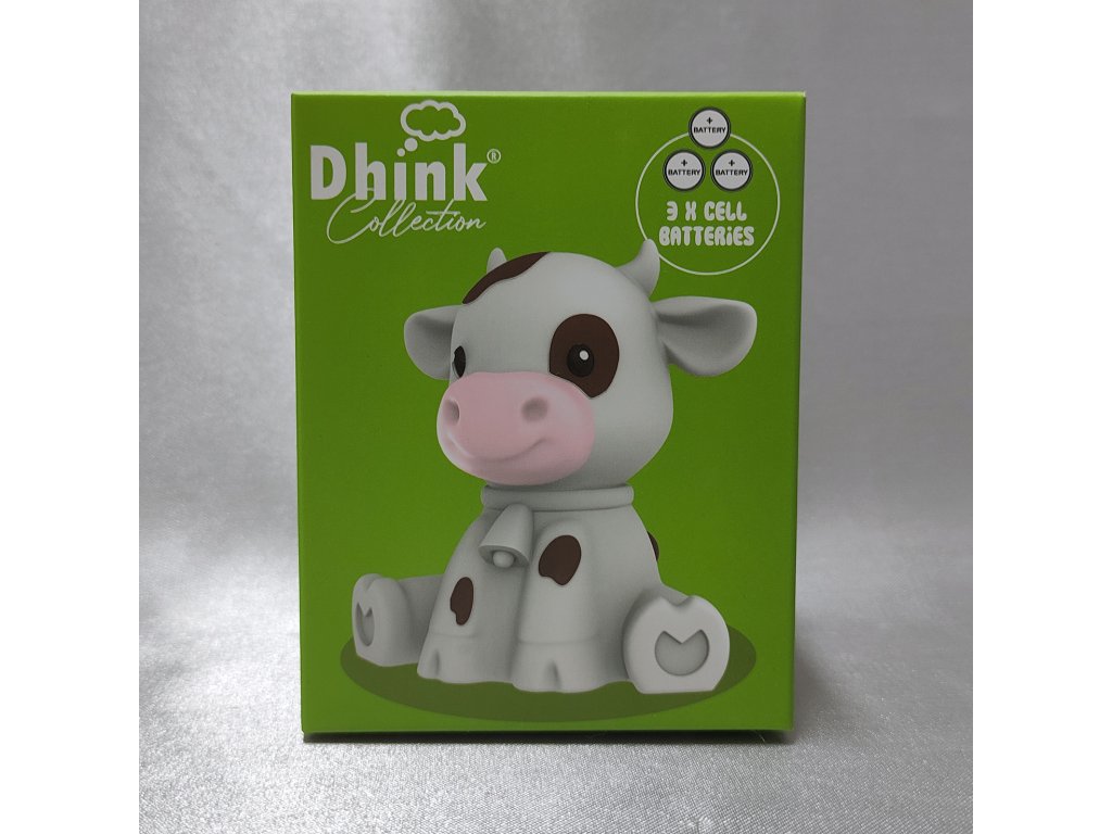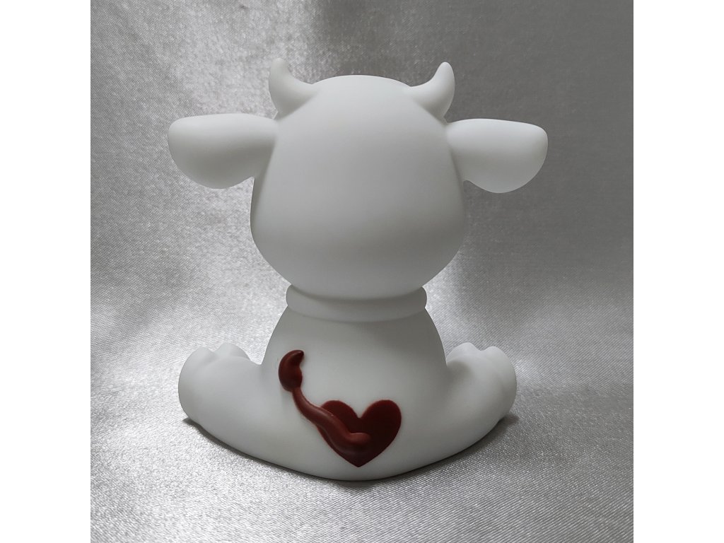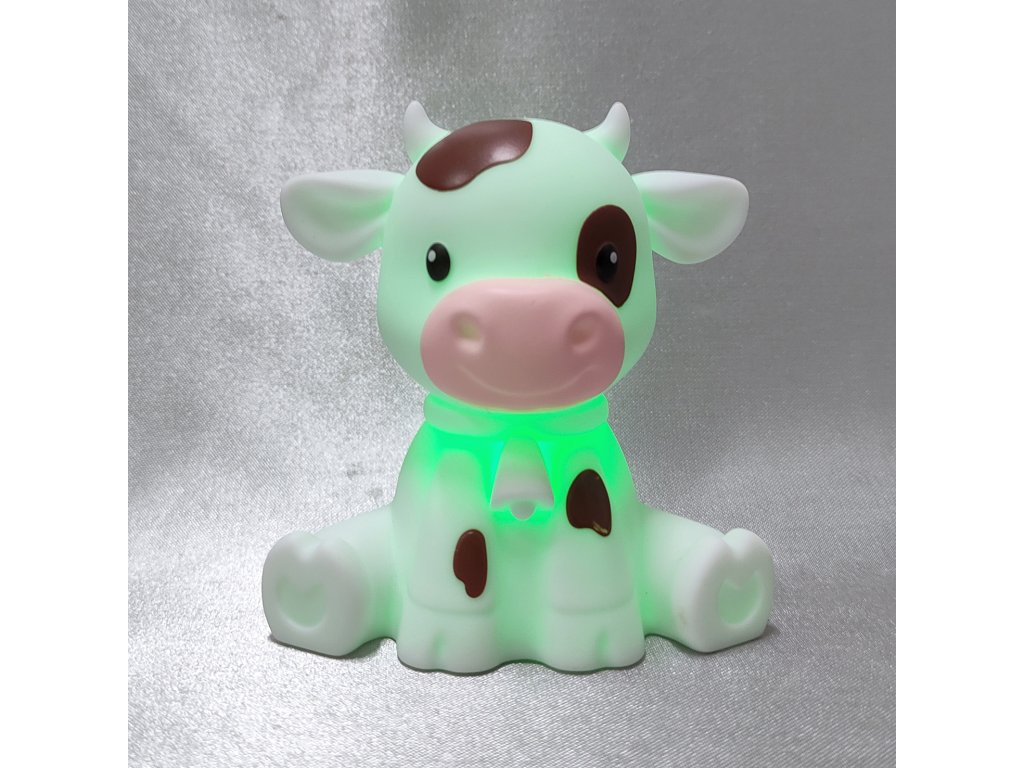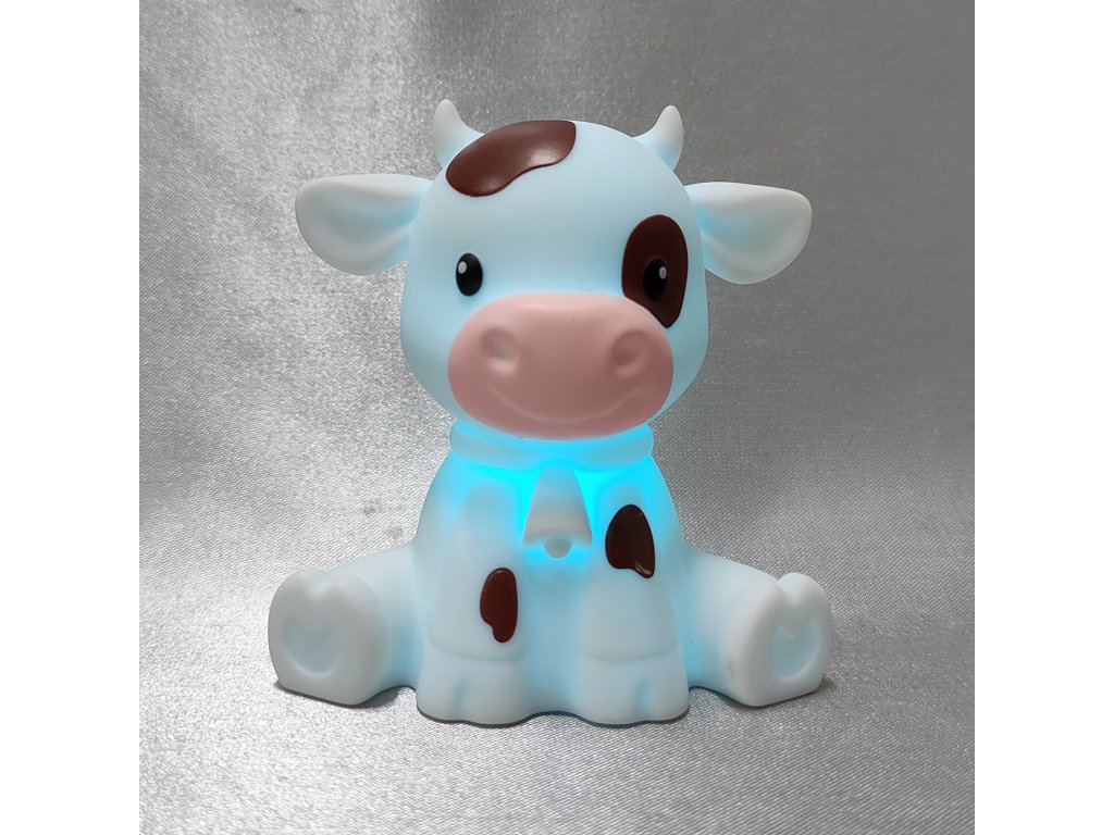 Hravé LED noční světýlko ve tvaru bílého telátky s hnědými flíčky.