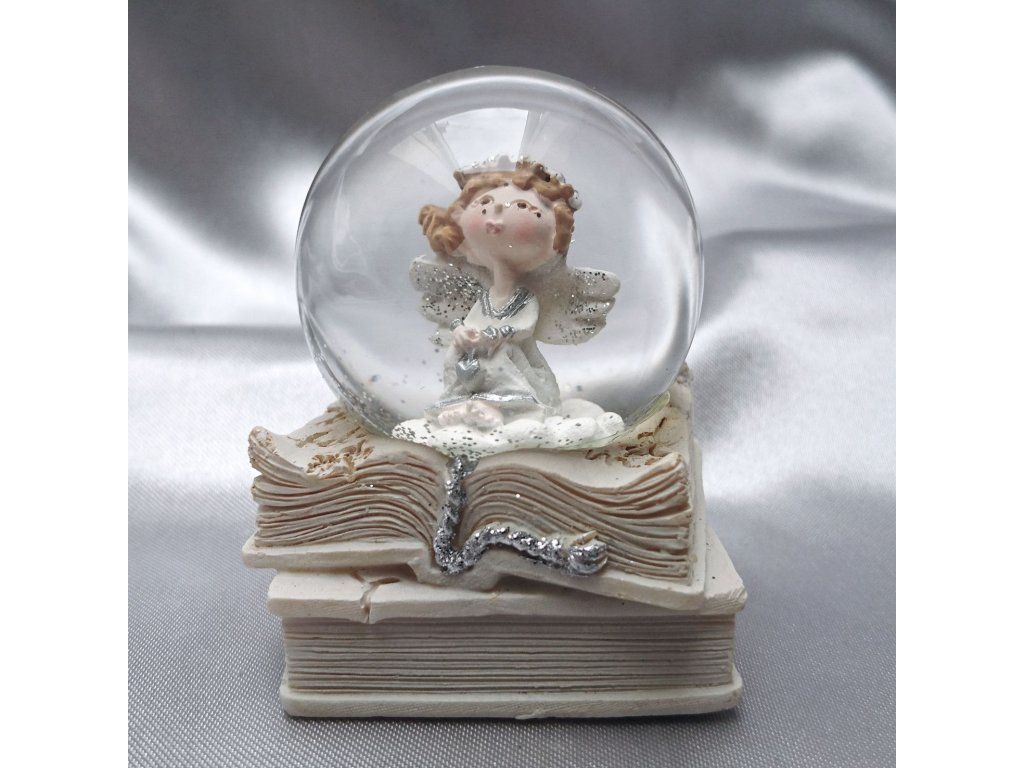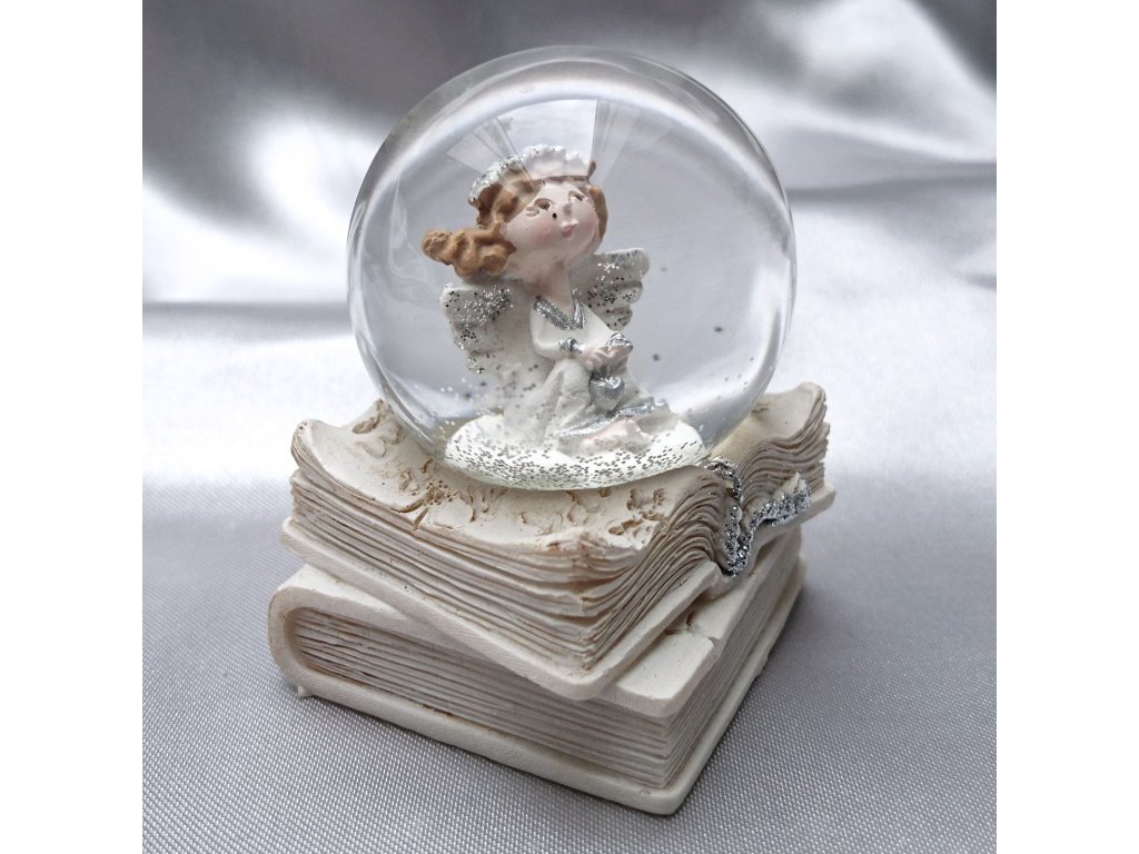 Andílek se srdcem ve skleněné kouli se střýbrnými třpytkami, která je posazená na knihách.
