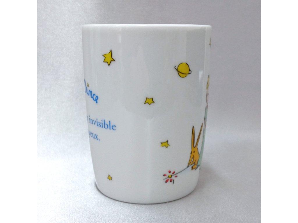 Bílý hrnek na kávu,čaj nebo kakao s nesmrtelnou a oblíbenou ilustrací z knihy Malý princ od francouzského spisovatele Antoina de Saint-Exupéryho.