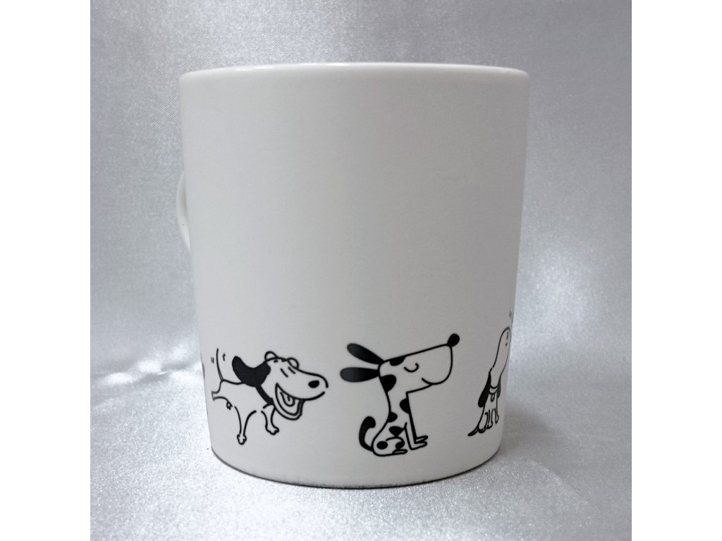 Bílý keramický hrnek s matnou vnější glazurou je zdobený obrázky psů v různých pozicích.