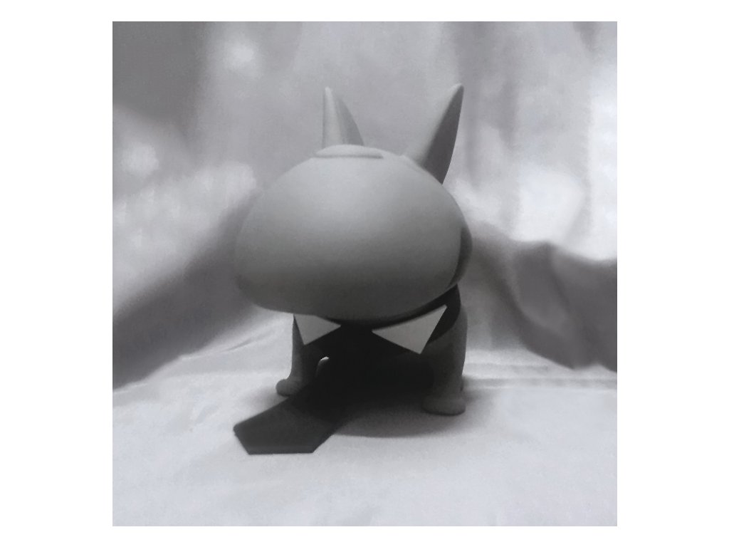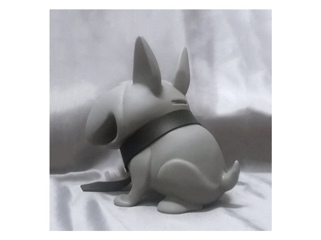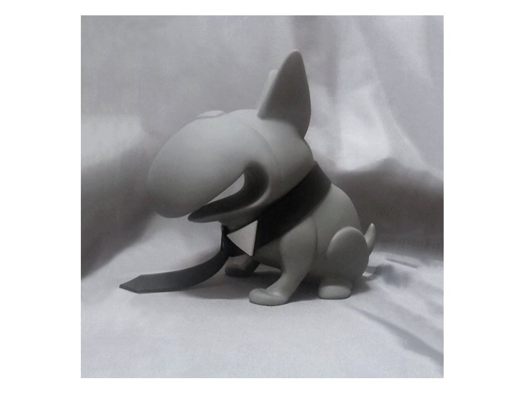 Tmavě šedá pokladnička ve tvaru bulteriéra se sundávacím bílým límečkem s černou kravatou, baleno v kulatém plastovém boxu, který jde použít jako krabičku na drobnosti nebo jako dvě misky na odkládání věcí.