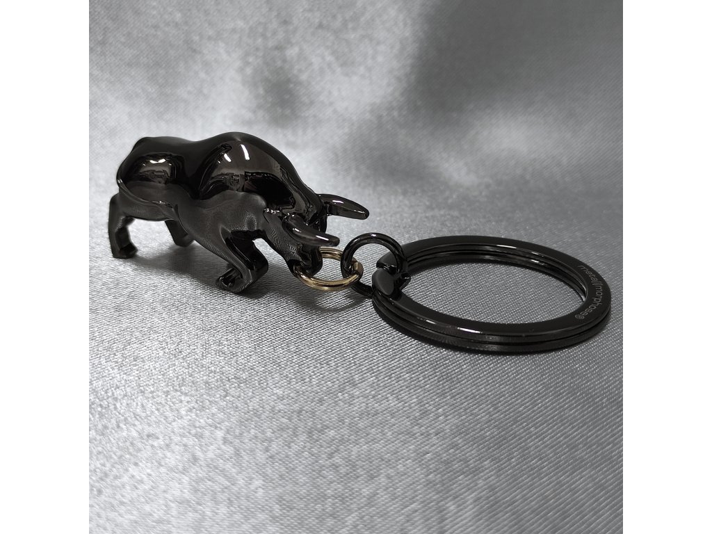 Černý lesklý býk se zlatým kruhem v nozdrách jako přívěsek na kroužku na klíče.
