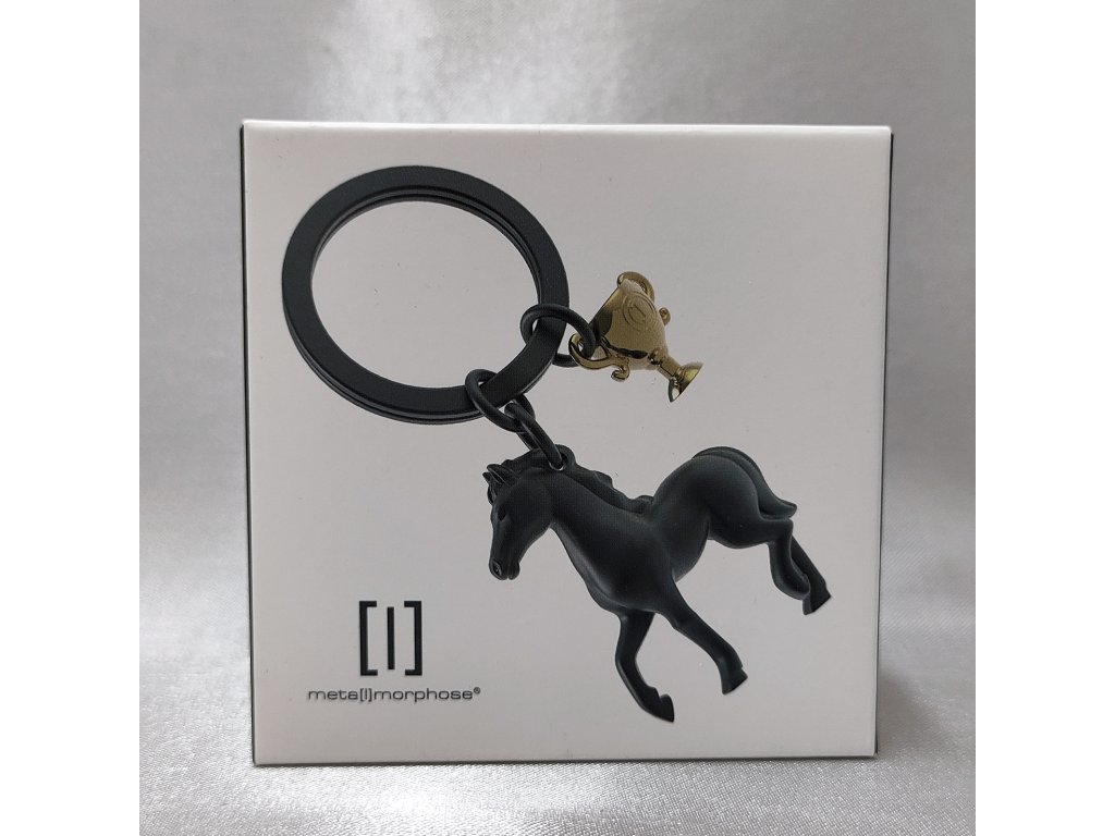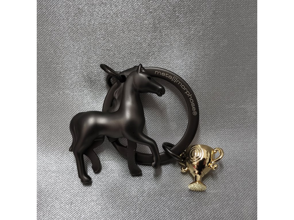 Kvalitní kovový kroužek na klíče s přívěsky závodního koně a trofejního poháru.
