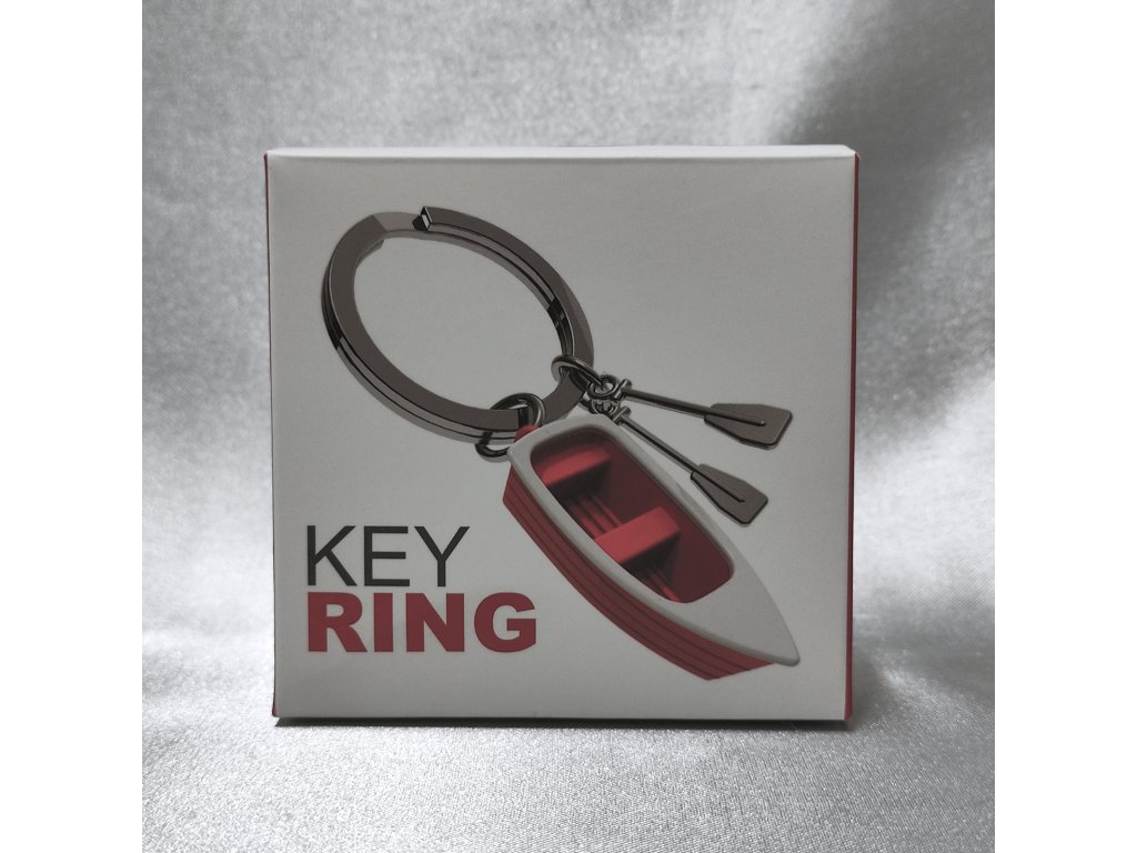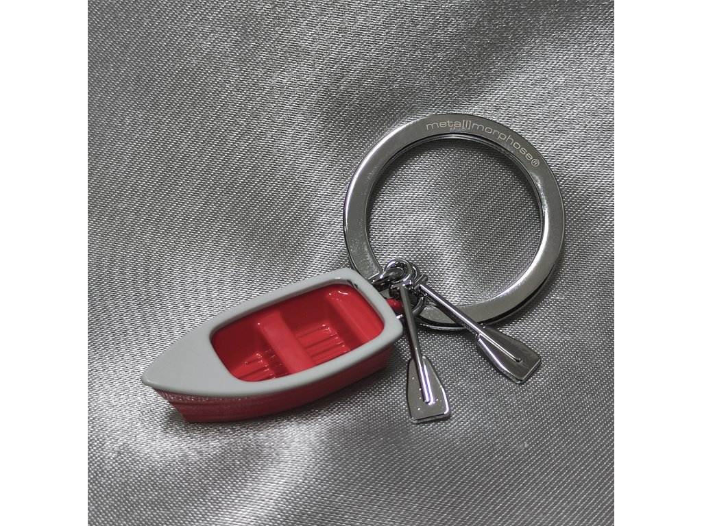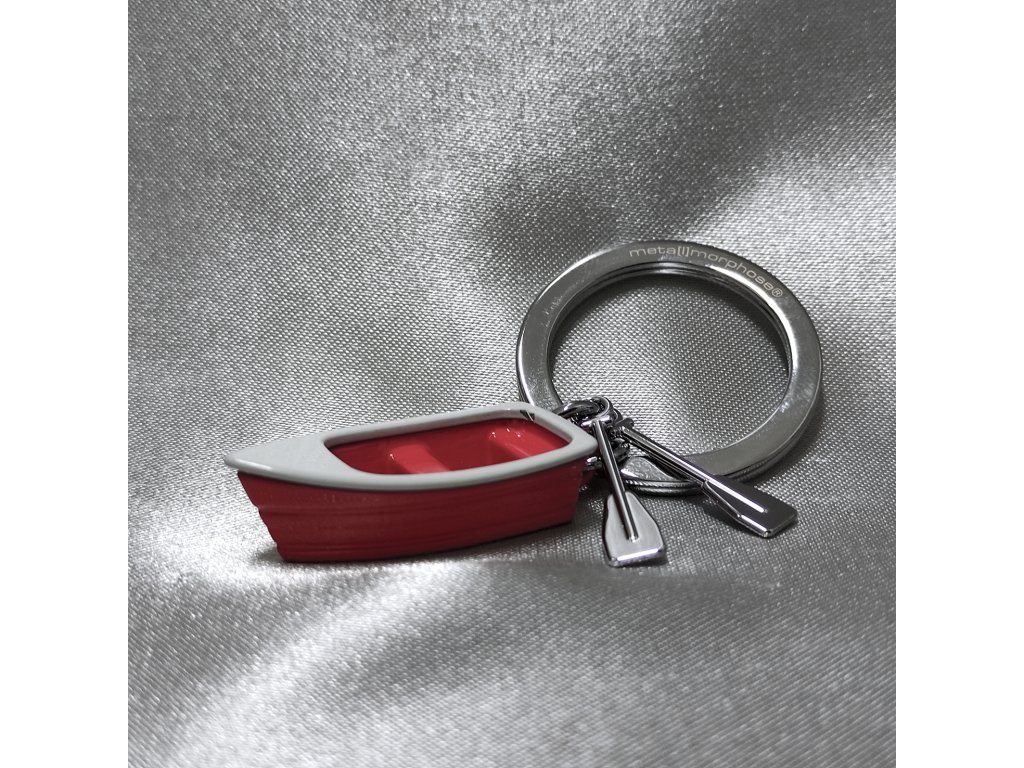 Červená lodička se stříbrnými vesly jako přívěsek na kroužku pro klíče.