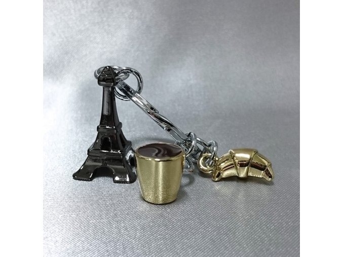 Kvalitní kovový kroužek na klíče s přívěsky, Eiffelovu věž doplňuje hrnek s kávou a croissant.