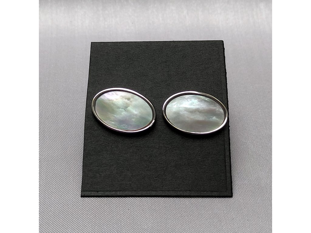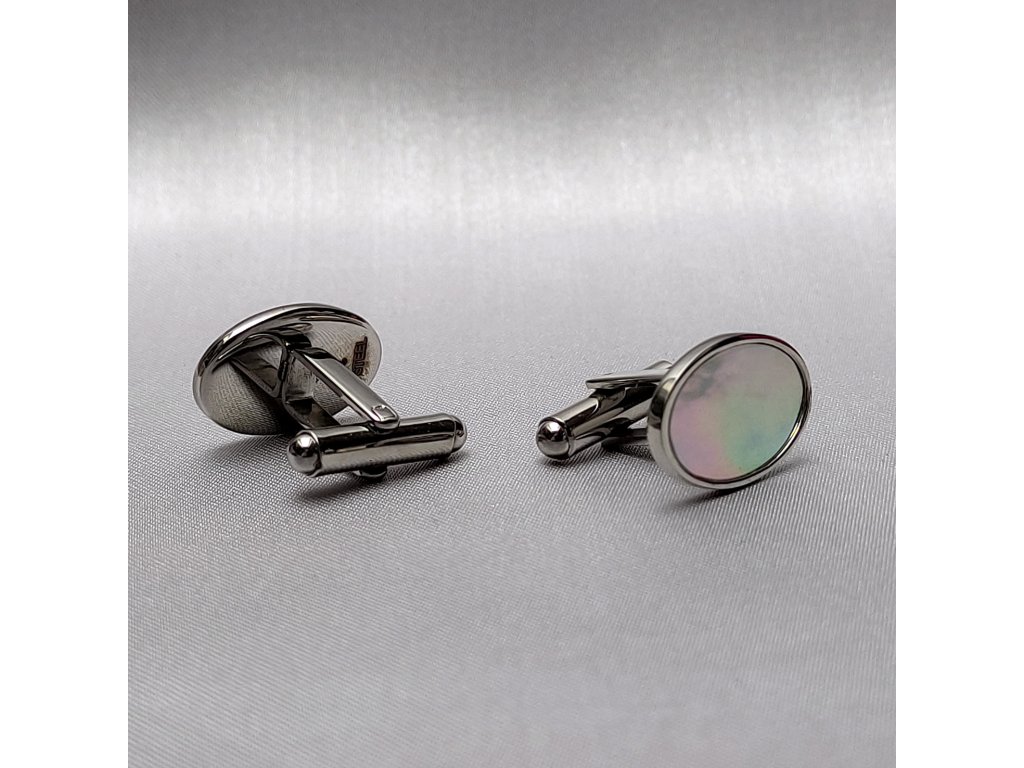 Manžetové knoflíčky z lesklé chirurgické oceli s oválným lůžkem vyloženým perletí .