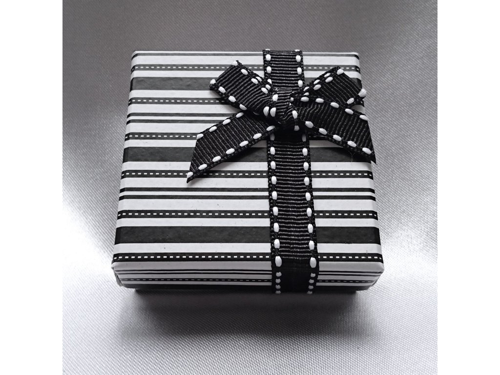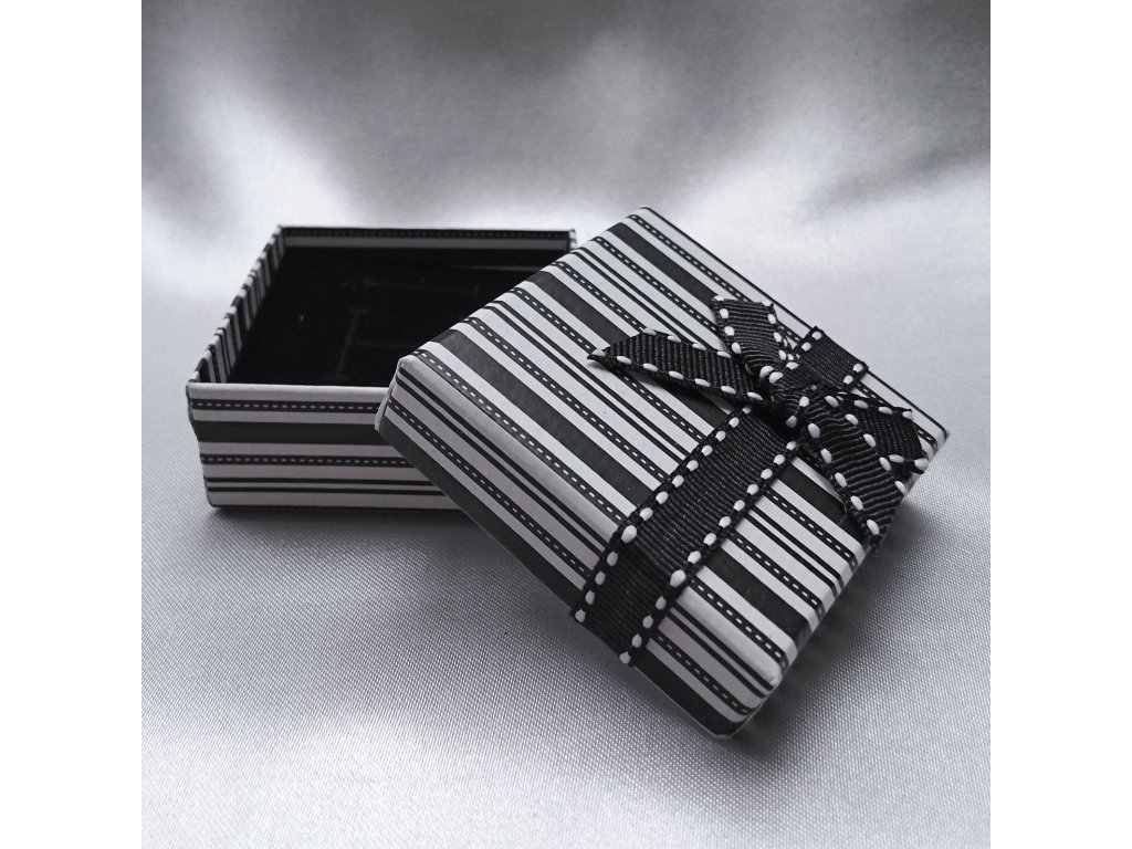 Čtvercová krabička na šperky a jiné drobnosti potažená hladkým papírem se vzorkem černobílých pruhů.