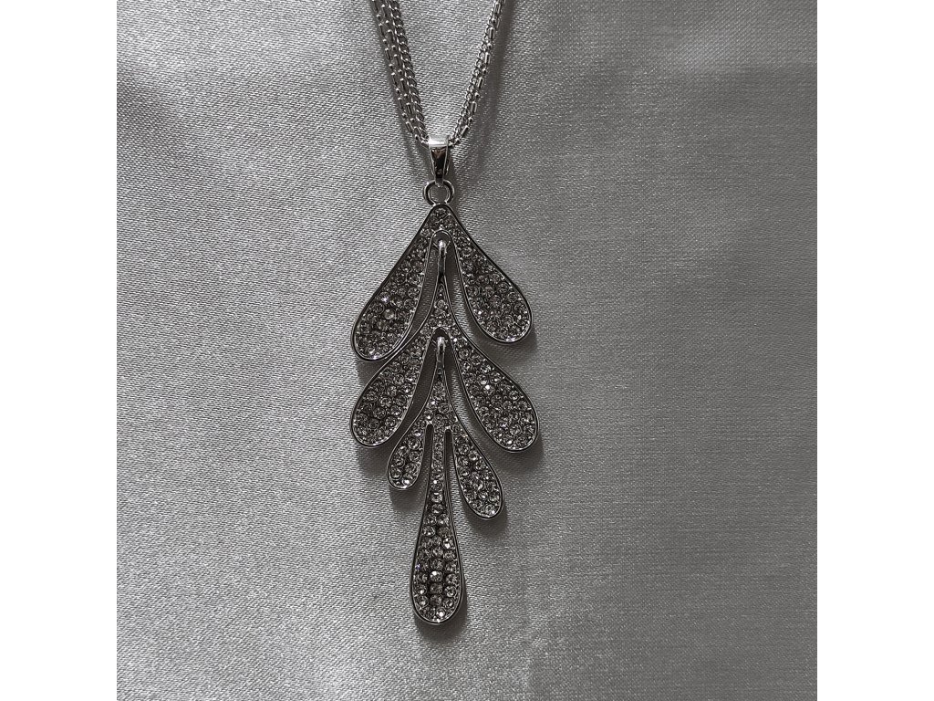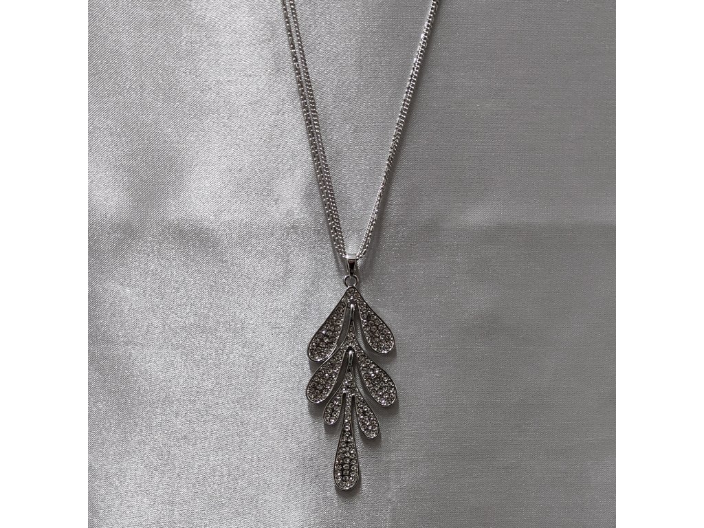 Náhrdelník tvoří třířadý dlouhý řetízek na kterém je přívěsek ve tvaru snítky, která má jednotlivé lístky bohatě osázené čirými štrasovými kamínky.