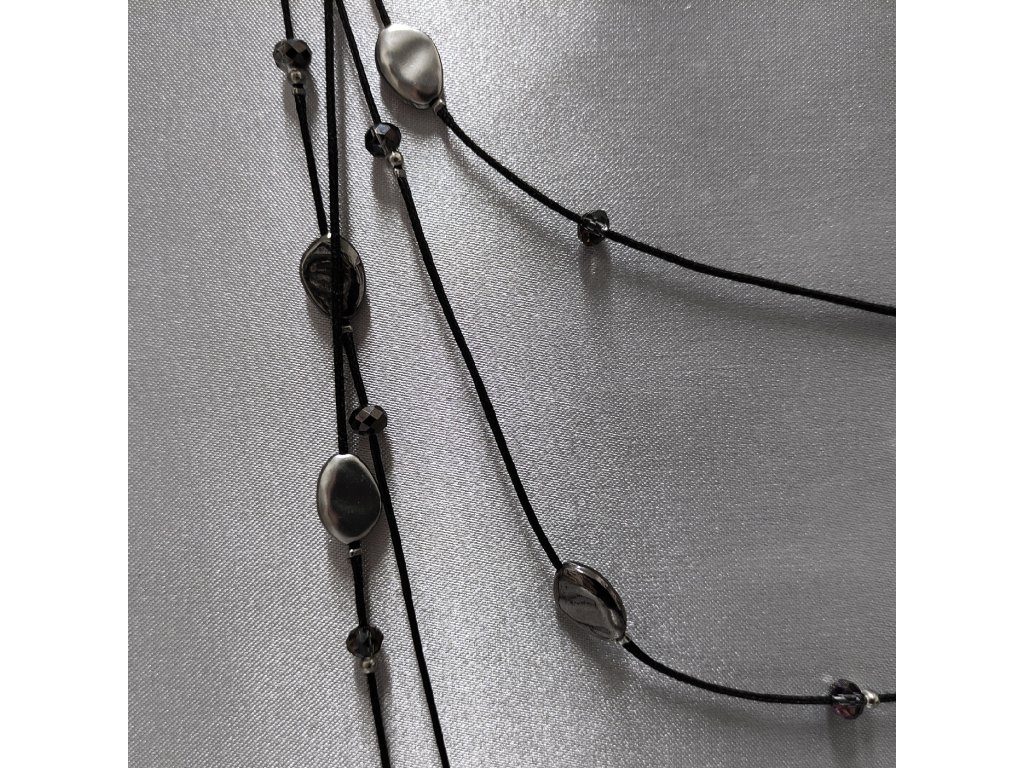 Náhrdelník ze čtyř tenkých voskovaných šňůrek v černé barvě, na kterých jsou uchycené různé korálky a mačkané korálky s nepravidelným tvarem a kovovým leskem.