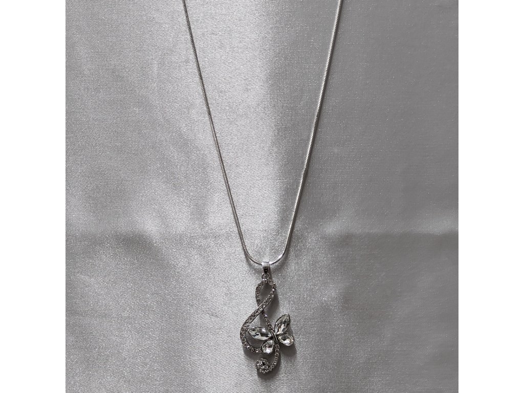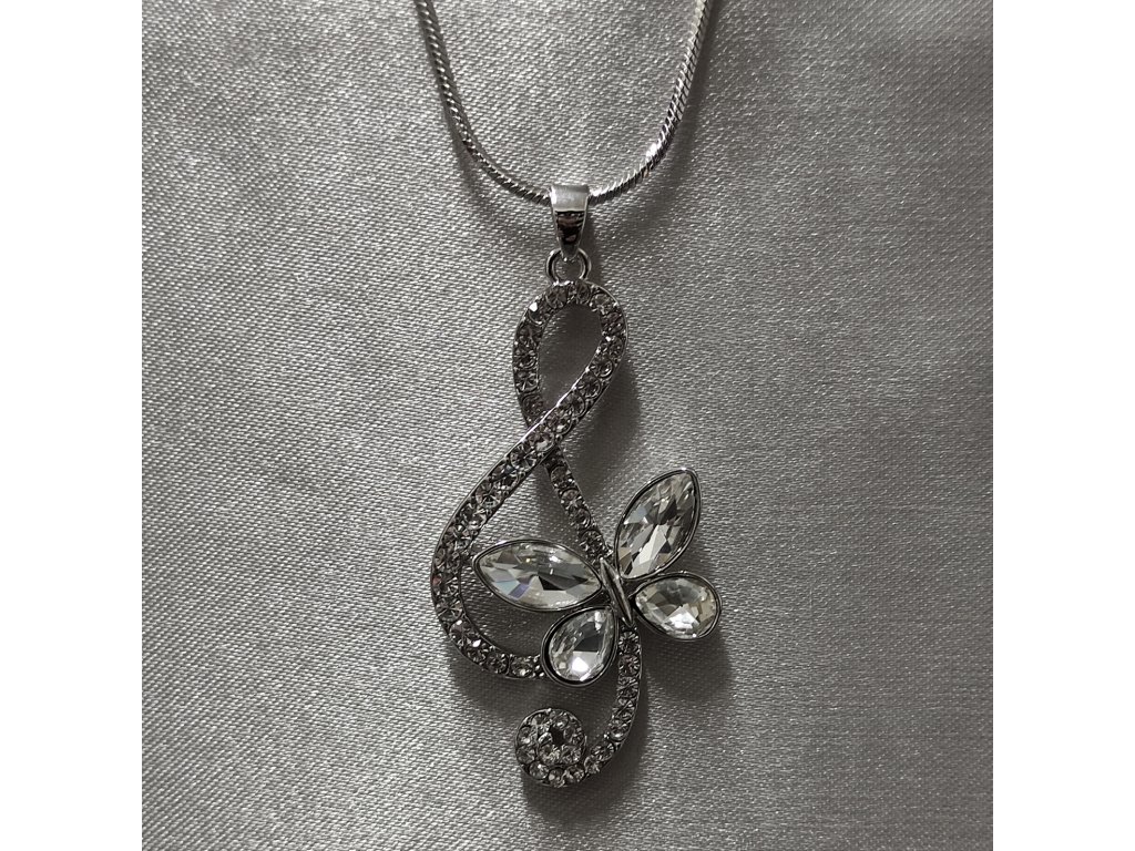 Houslový klíč s motýlkem je bohatě osázený čirými štrasovými kamínky a doplňuje dlouhý řetízek s hranatou hadí vazbou.