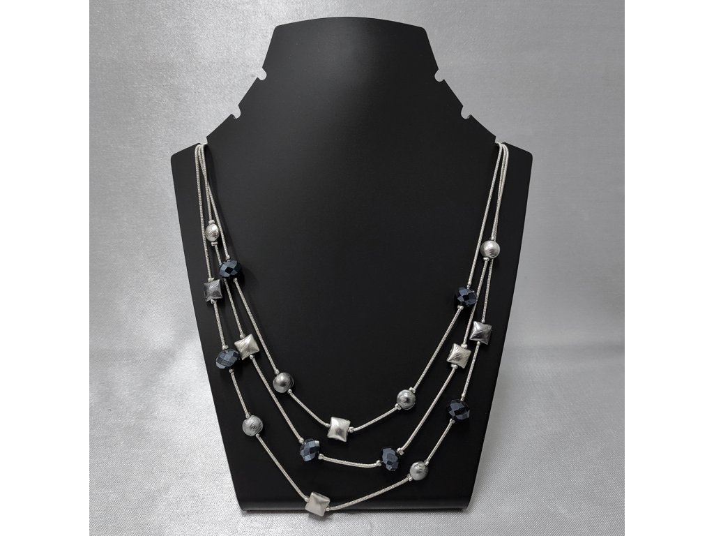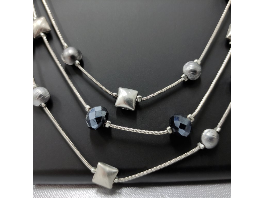 Třířadý jemný řetízek s kulatou hadí vazbou je ozdobený různými korálky v tónech šedé.