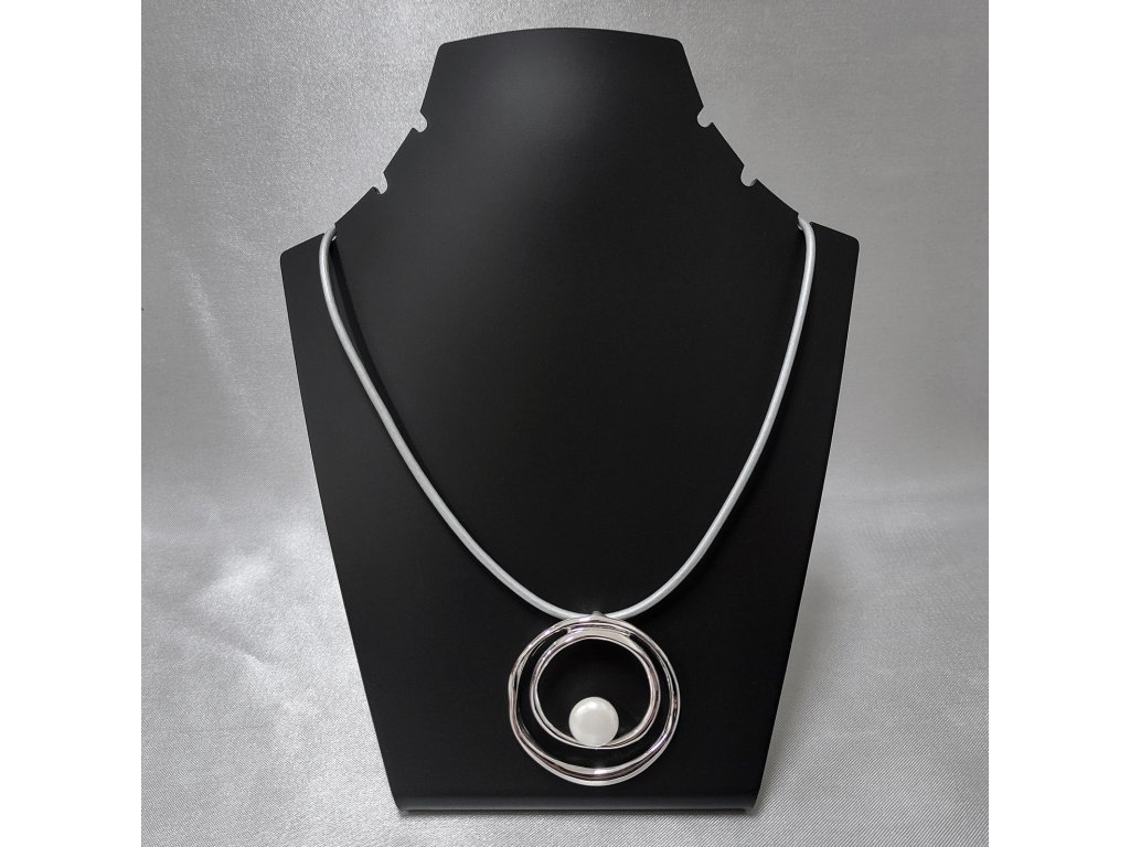 Přívěsek složený ze dvou nepravidelných kruhů, na kterých je uchycena větší bílá půlperla, je zavěšený na šedé šňůrce z imitace kůže.