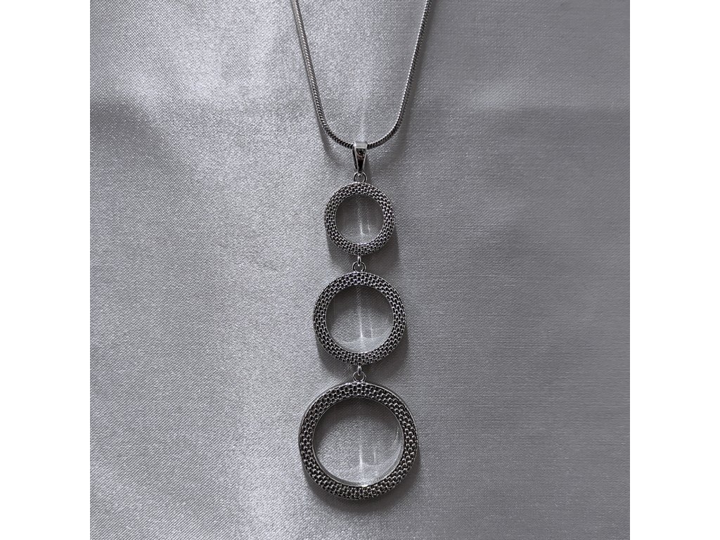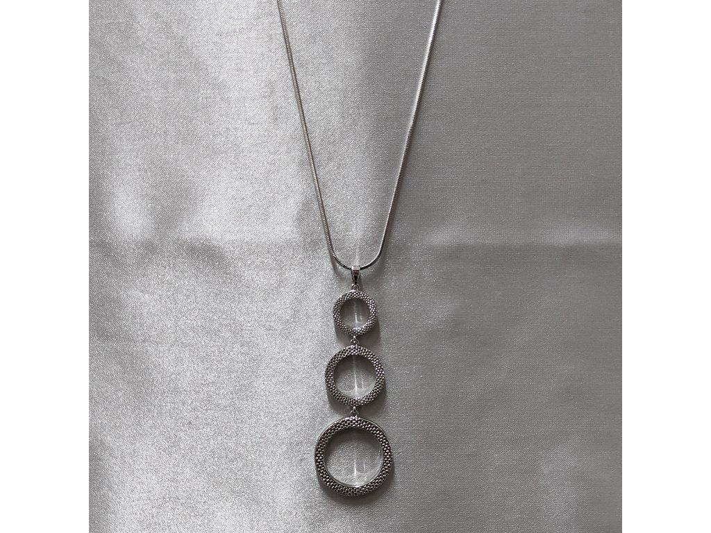 Dlouhý přívěsek je složený ze tří různě velkých kroužků, které mají zajímavou strukturu a matnější vzhled.