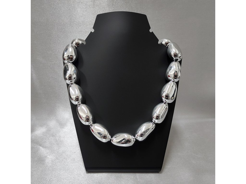 Výrazný náhrdelník poskládaný z kovových korálků ve tvaru oblázků s lesklým hladkým finišem.