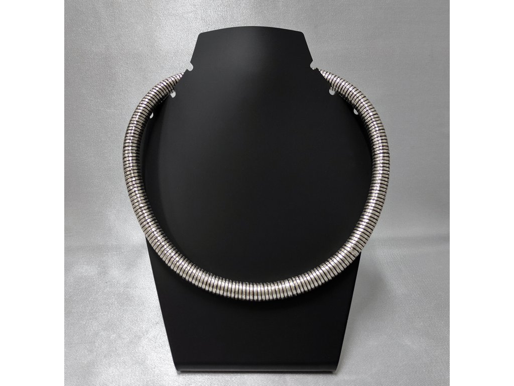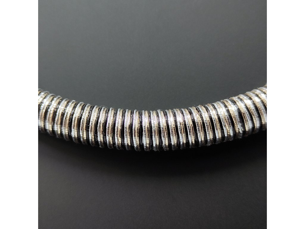 Nadčasový náhrdelník v podobě robustnější pružné obruče, která je opletená lurexovou nitkou v barvách stříbra, zlata a temné černé.