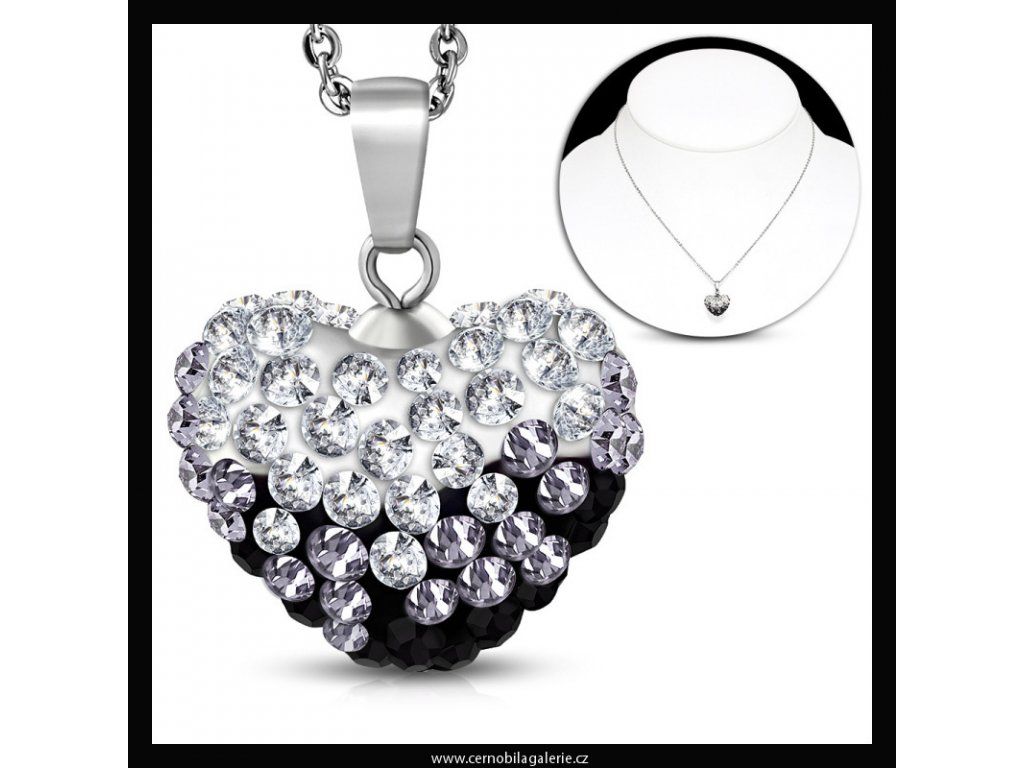Náhrdelník z chirurgické oceli, klasický očkový řetízek s přívěskem ve tvaru menšího srdce osázeného broušenými kamínky v černé a řiré barvě.