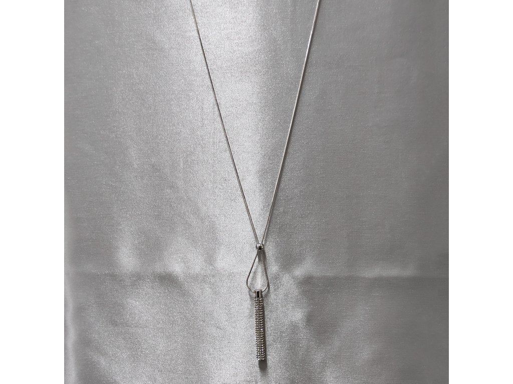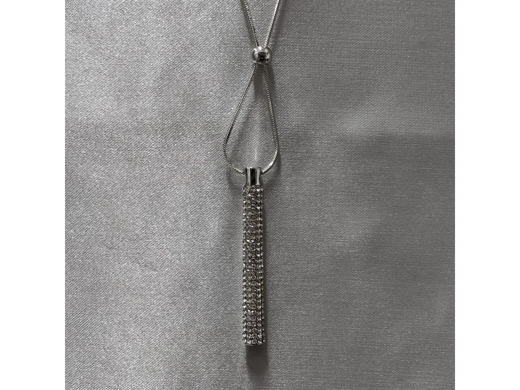 Na dlouhém řetízku s jemnou hranatou hadí vazbou je jednoduchý nadčasový přívěsek ve tvaru válce, který je z části osázený drobnými štrasovými kamínky v čiré barvě.