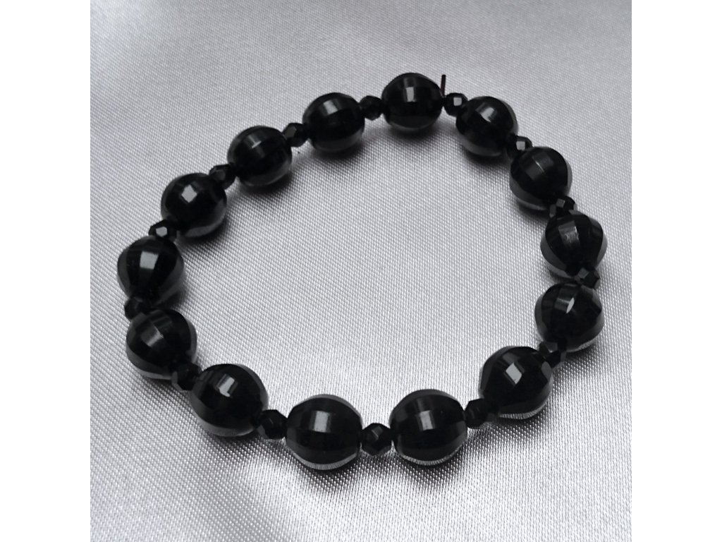 Pružný náramek ze dvou velikostí černých kulatých skleněných korálků.