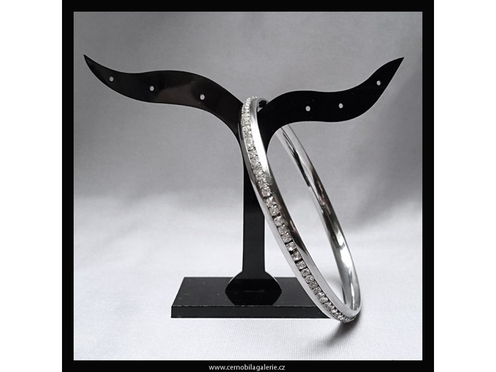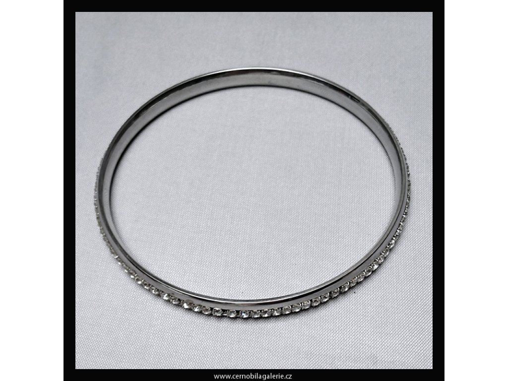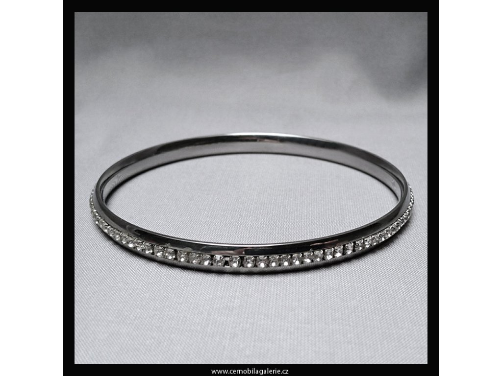Jednoduchý kruhový náramek z chirurgické oceli se středovou drážkou osázenou drobnými broušenými kamínky v čiré barvě.