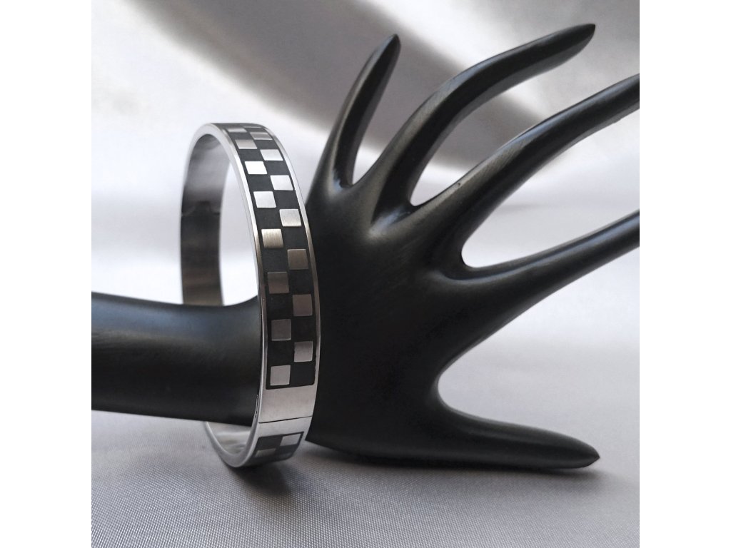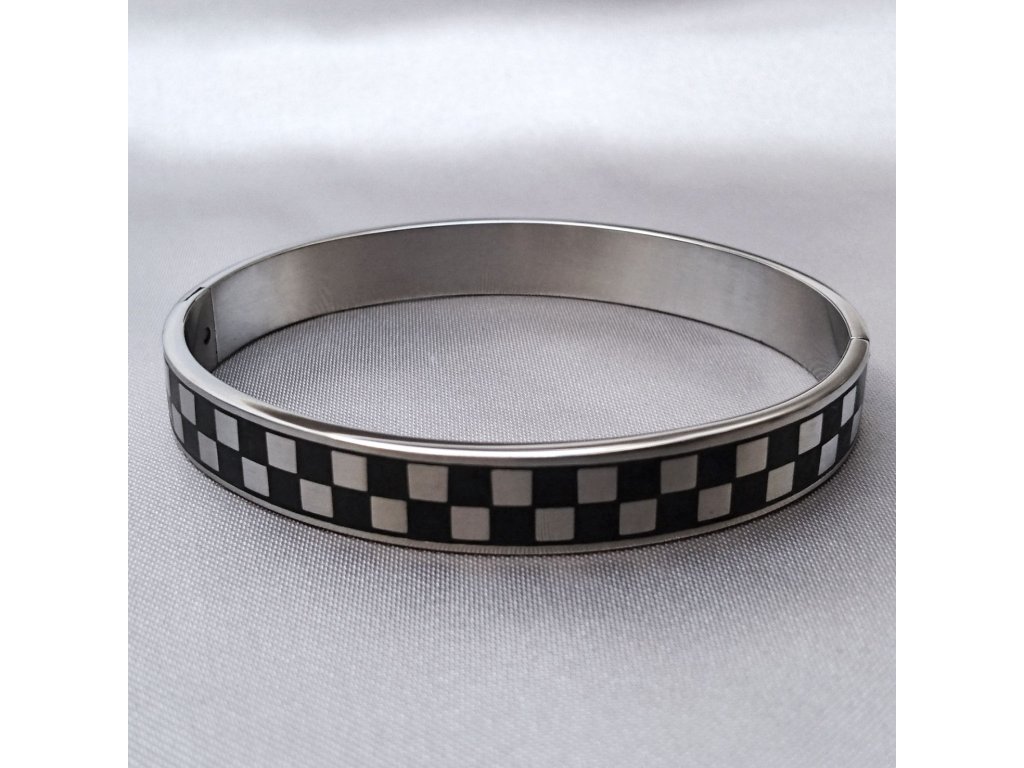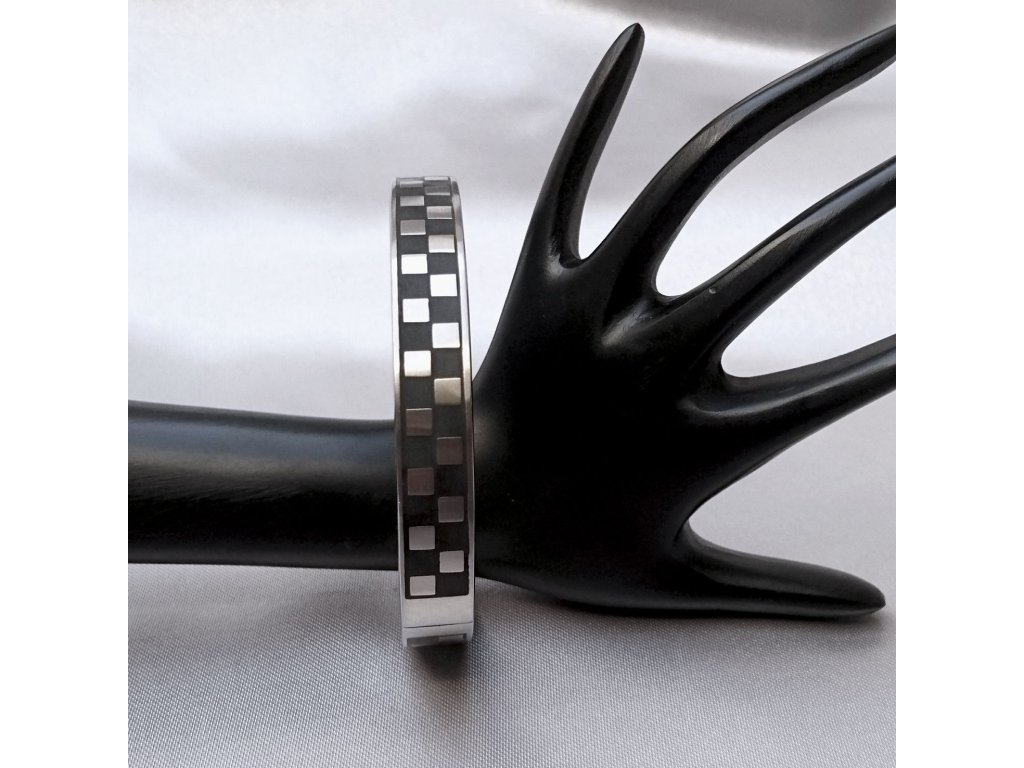 Pevný náramek z chirurgické oceli zdobený dvouřadým šachovnicovým vzorem.