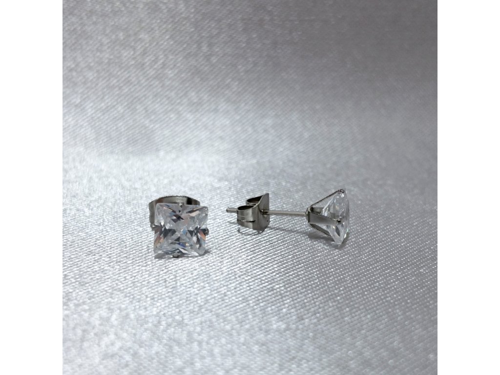 Jednoduché náušnice z čtvercových broušených kamínků v čiré barvě osazených do lůžka.