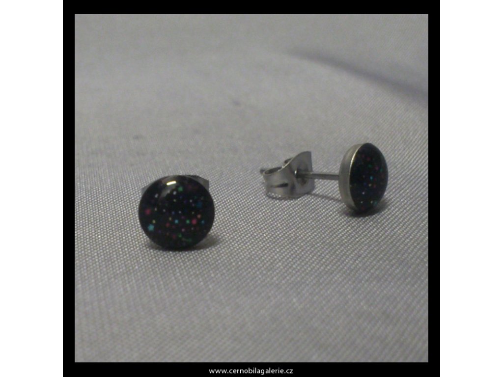 Klasické peckové náušnice z chirurgické oceli s vrstvou černé pryskyřice v níž jsou drobounké barevné třpytky.