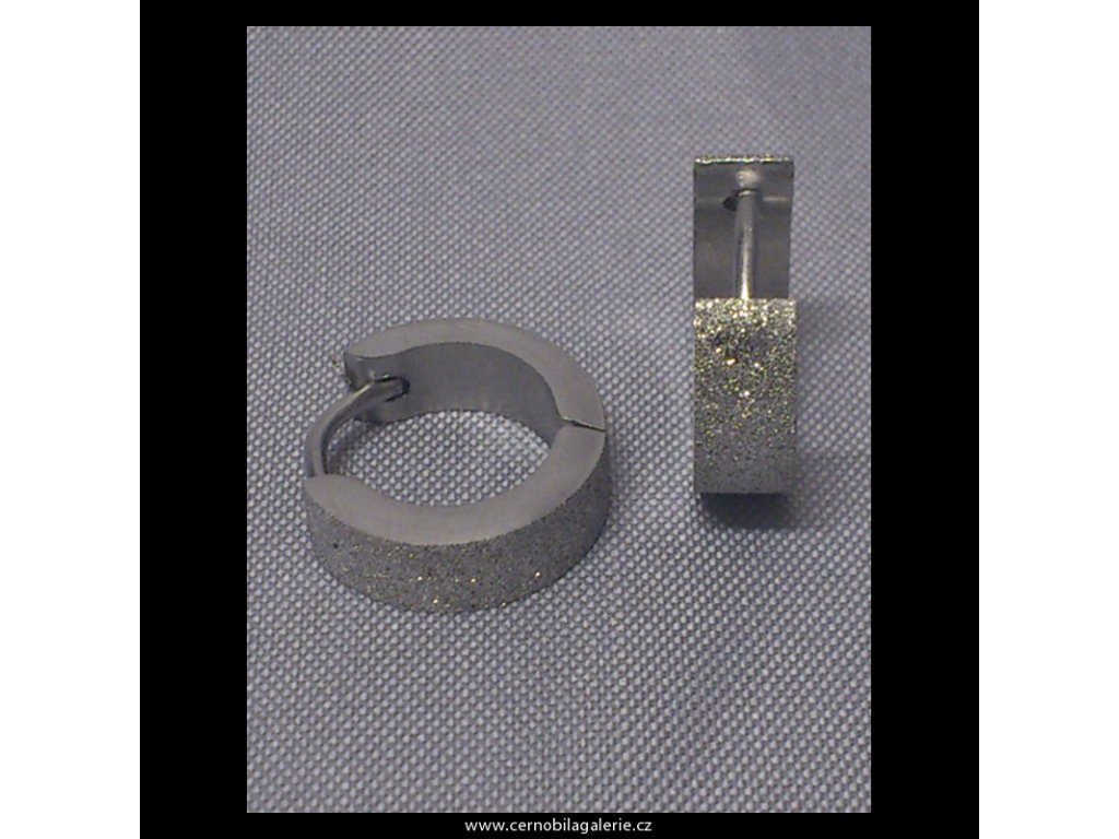Klasické kroužkové náušnice z chirurgické oceli jejichž povrch je zdoben třpytivým brusem-pískováním, připomínajícím diamantový prach.