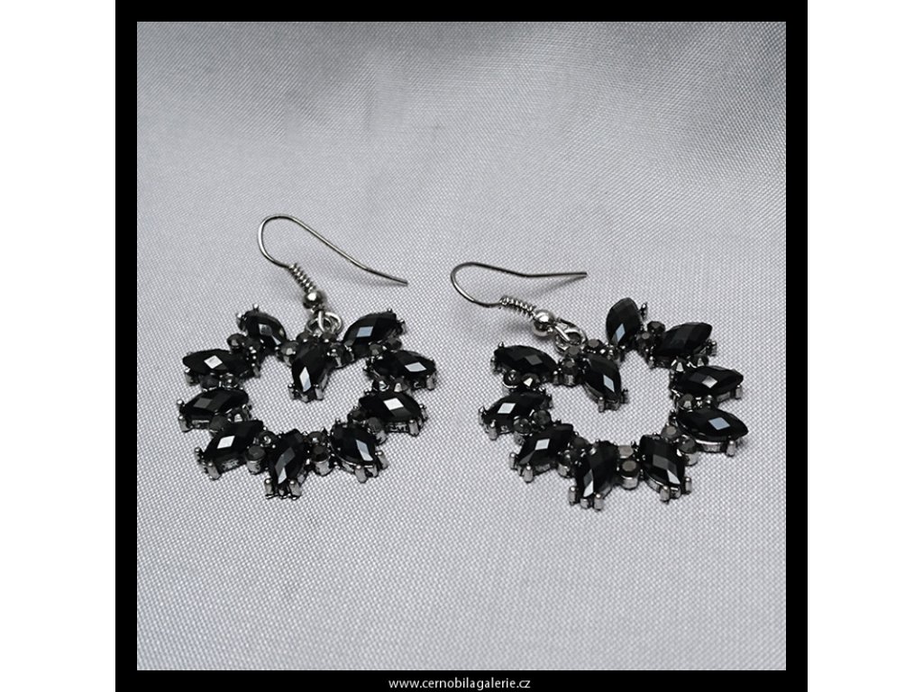 Vzdušné bižuterní náušnice ve tvaru srdce poskládaného z černých broušených kamínků v kovovém lůžku.