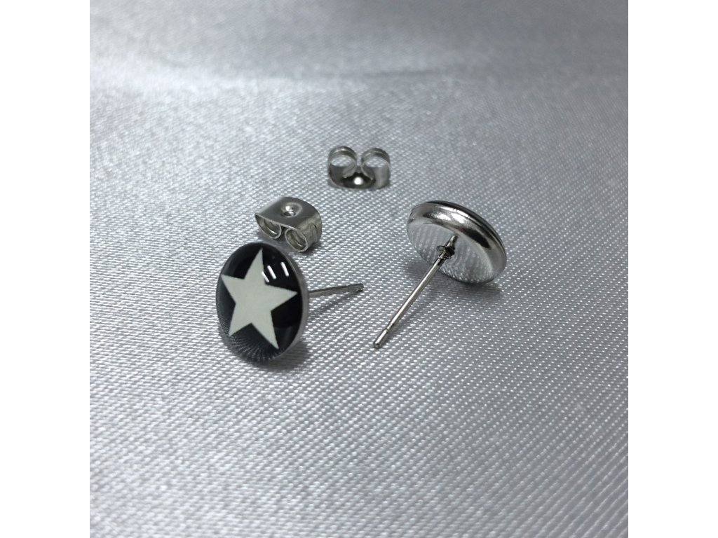 Peckové náušnice s bílou pěticípou hvězdou na černém podkladu, která je pod oblou čočkou z čiré pryskyřice.