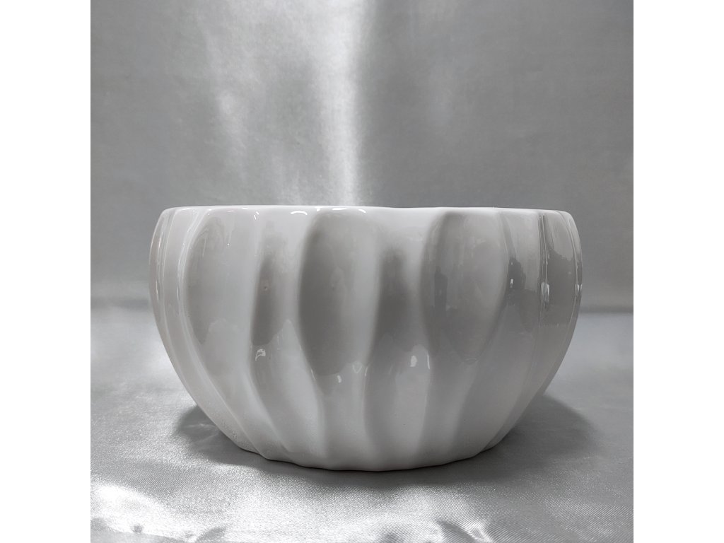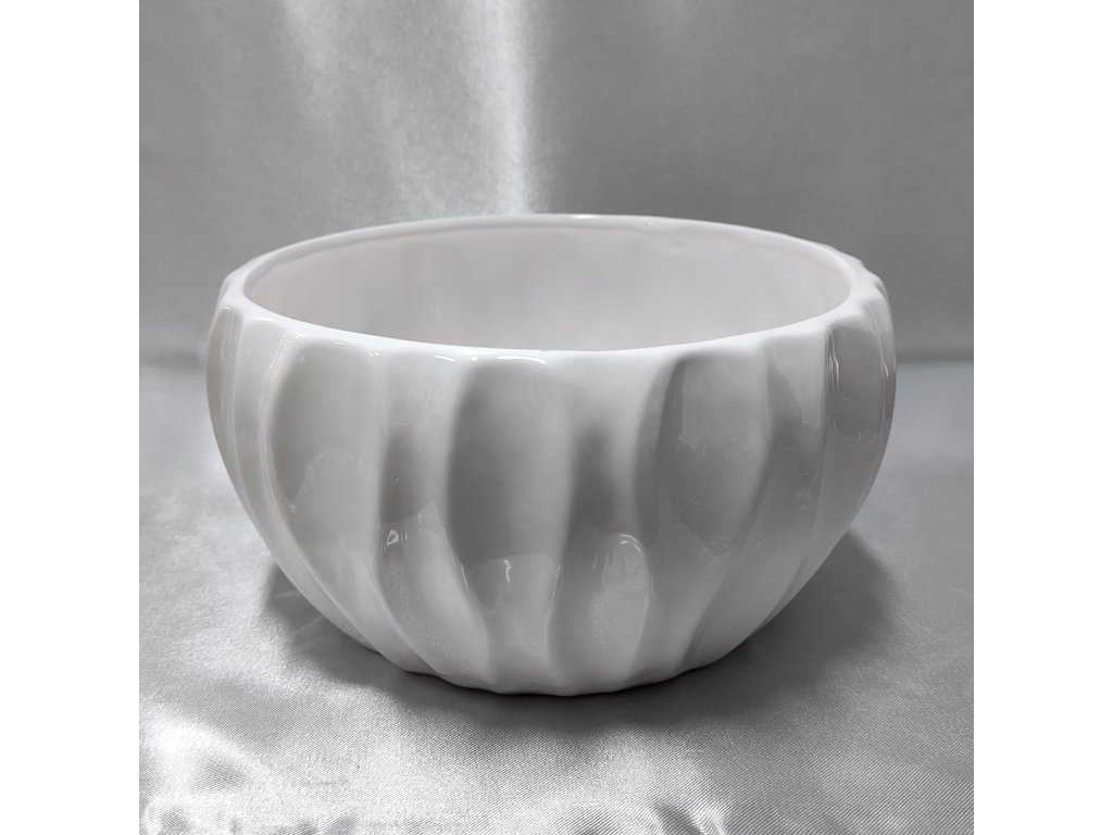 Keramická mísa v bílém provedení se zajímavě zvlněným povrchem slouží jako obal na květináče.