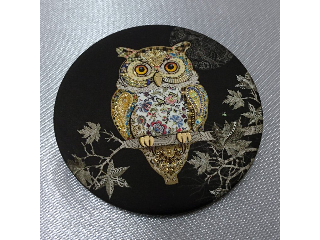 Velký magnet s motivem sovy na černém podkladu v kombinaci se zlacením.