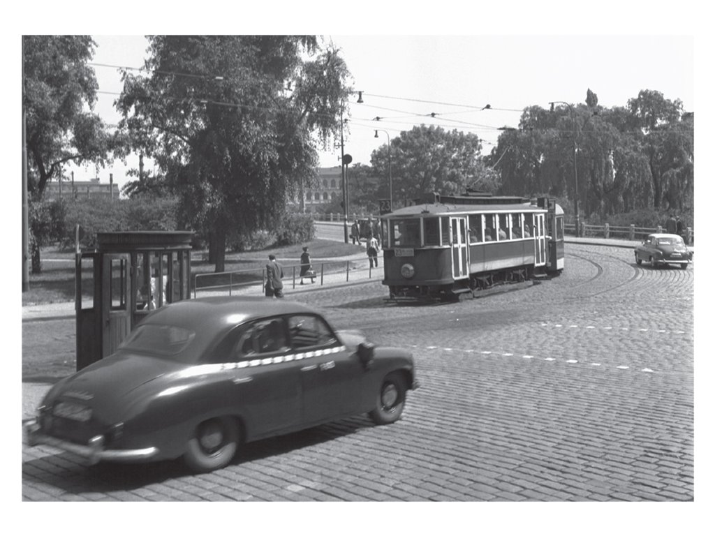 Pohlednice s motivem z křižovatky Na Klárově a jejím čilým dopravním ruchem.