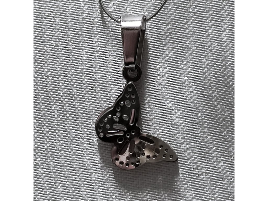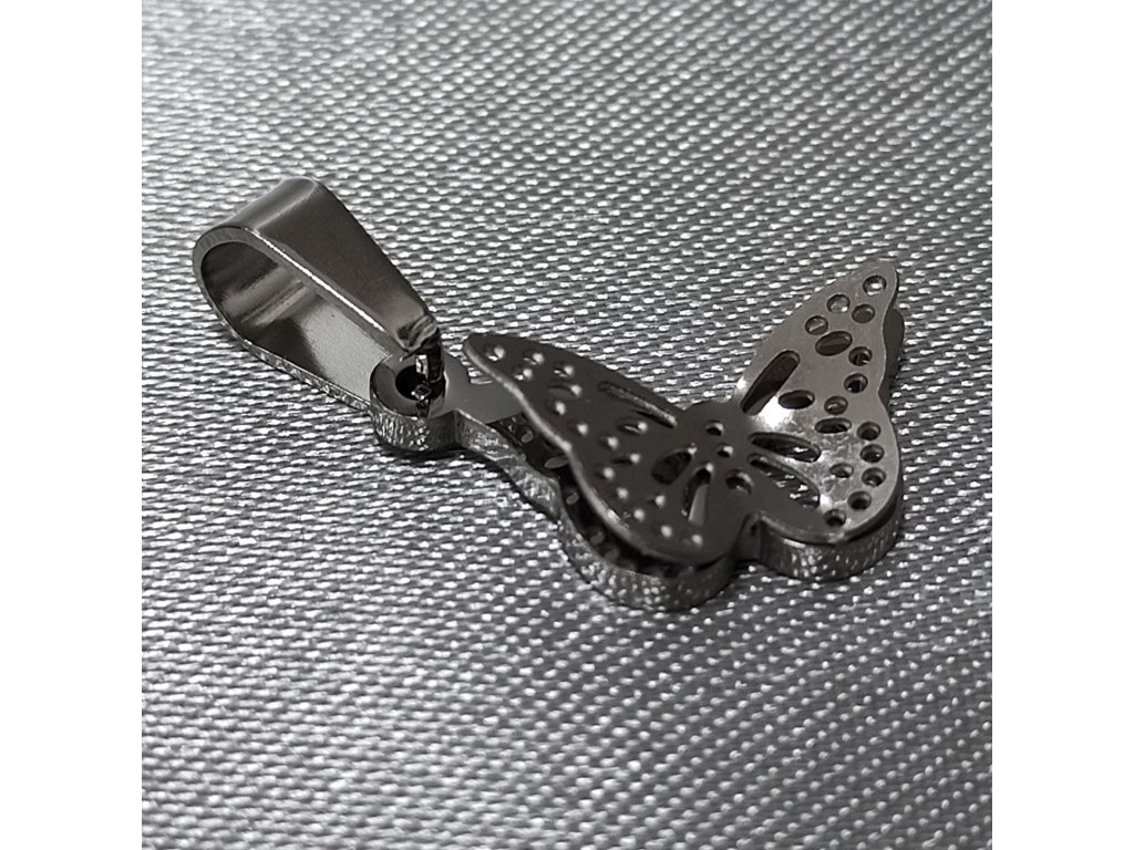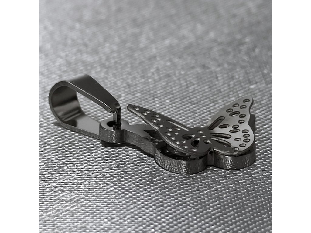 Malý přívěsek z lesklé chirurgické oceli ve tvaru motýlka se zdobenými křídly s 3D efektem.