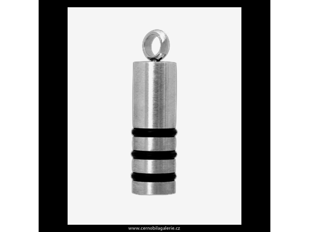 Přívěsek z chirurgické oceli ve tvaru jednoduchého válce, který je zdobený černým silikonem.