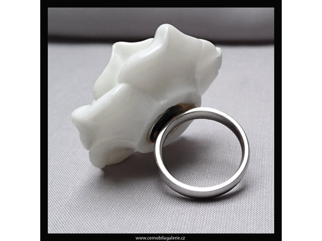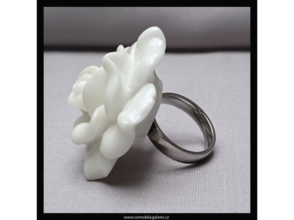Velký výrazný prsten tvoří oblý uzavřený kroužek, který zdobí velký květ růže z pryskyřice v bílé barvě.