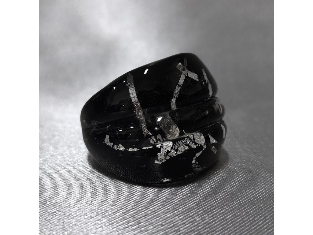 Zajímavý černý prsten s vroubky a stříbrným žíháním vyrobený ze skla.