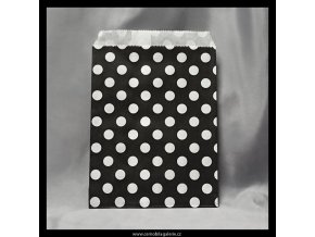 Malý sáček s mléčným zabarvením zdobený motivem bílých teček má lepící lištou pro uzavření.