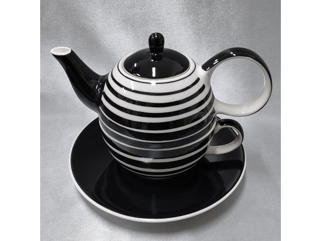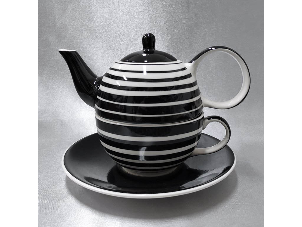 Set čajové konvice, šálku a podšálku s nadčasovým vzorem nepravidelně širokých proužků.
