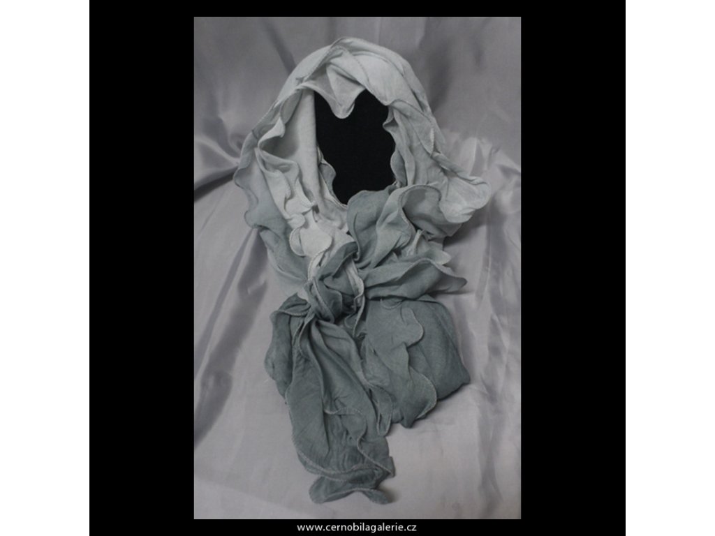 Příjemná módní šála z batikované šedobílé fáčoviny zdobená volánem.