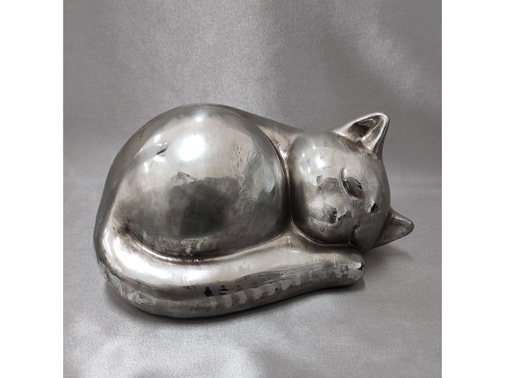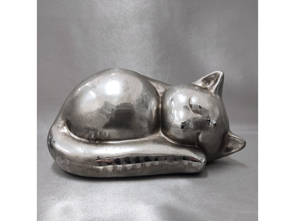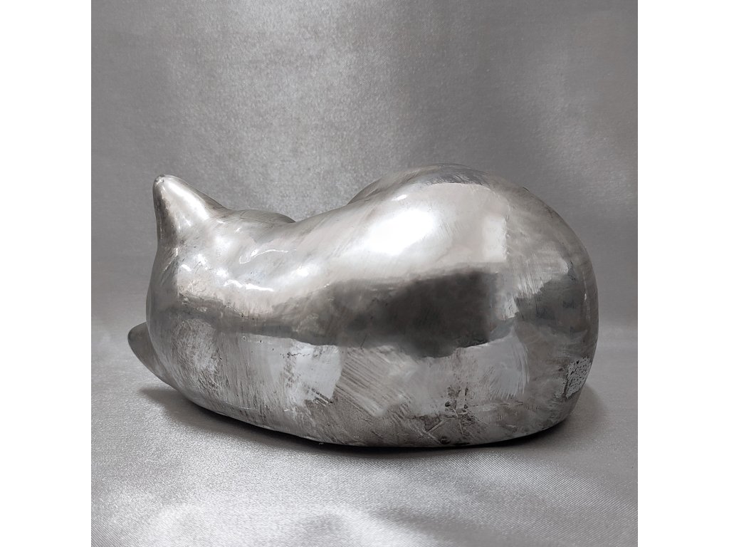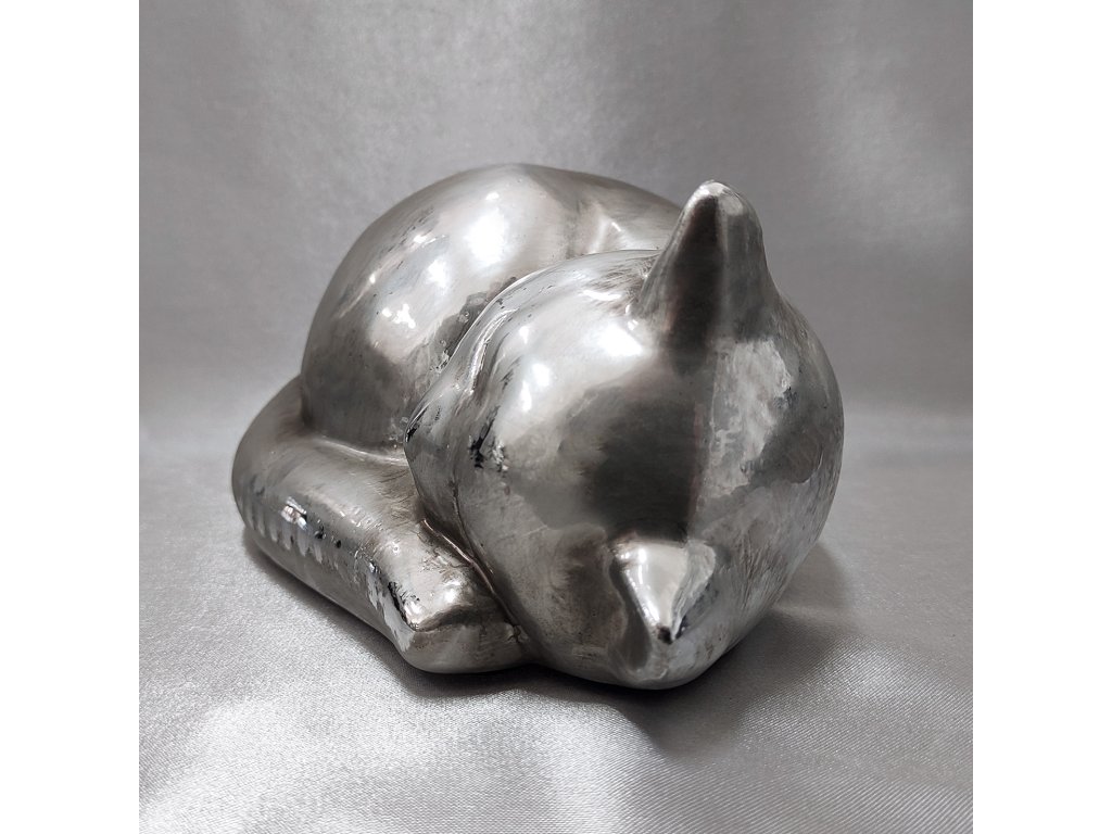Elegantní dekorační figurka spící kočky stočené do klubíčka s moderní, stříbrnou povrchovou úpravou, kombinující lesk, mat a černou patinu.