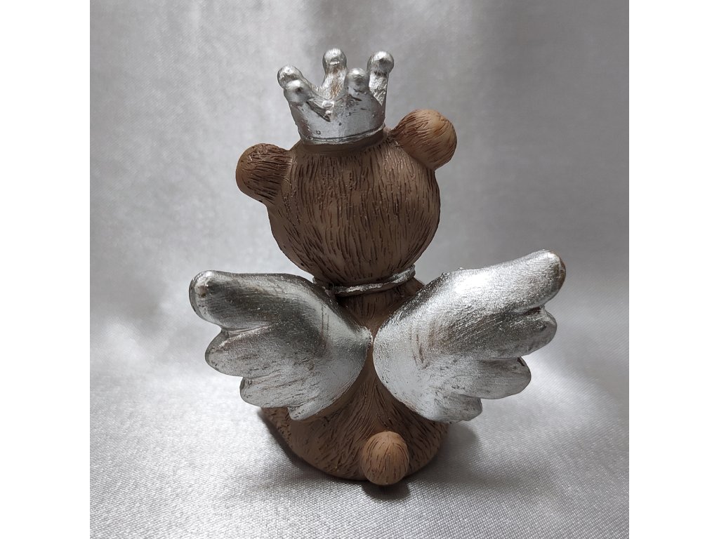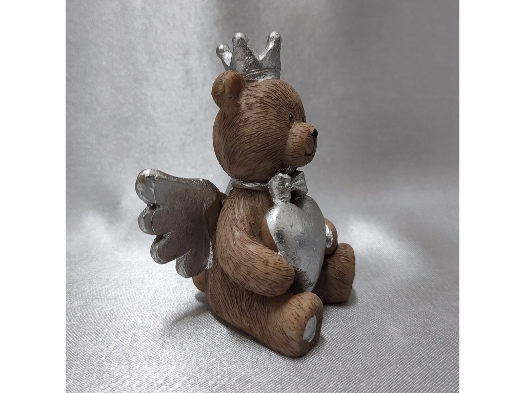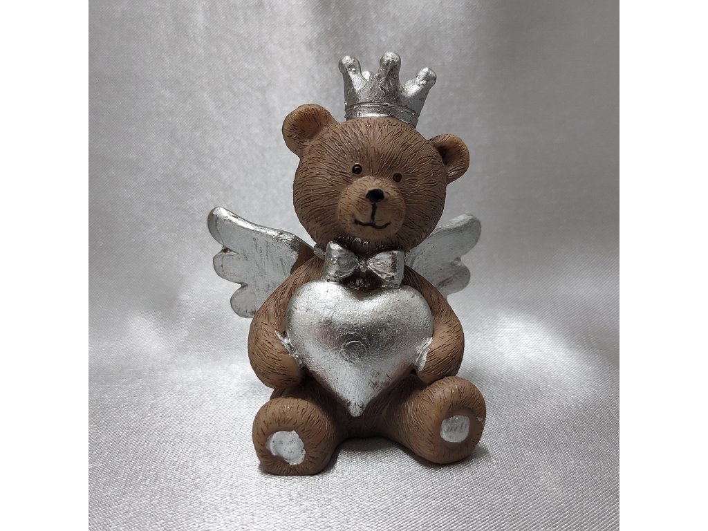 Hnědý sedící medvěd s mašličkou, korunkou, velkým srdcem a se stříbrnými křídly.