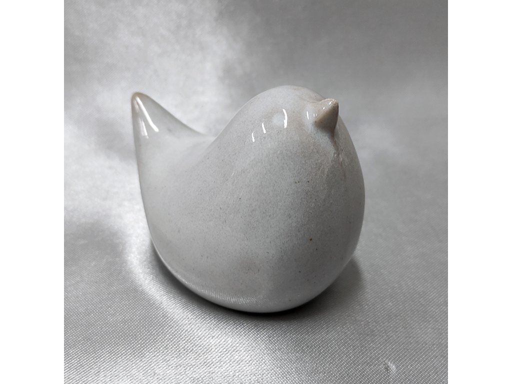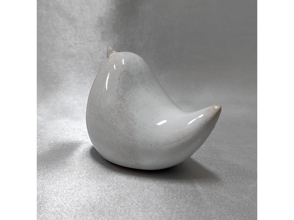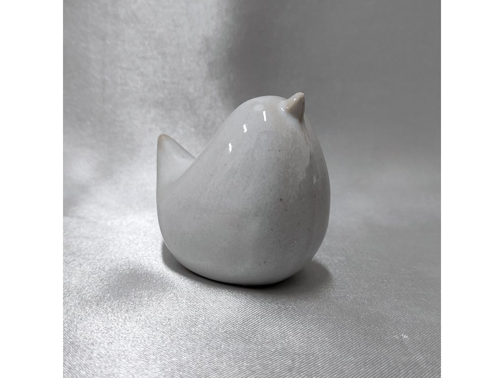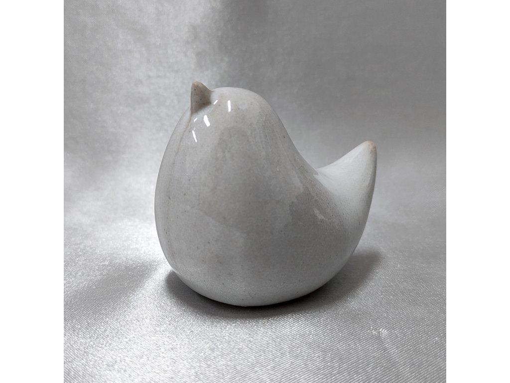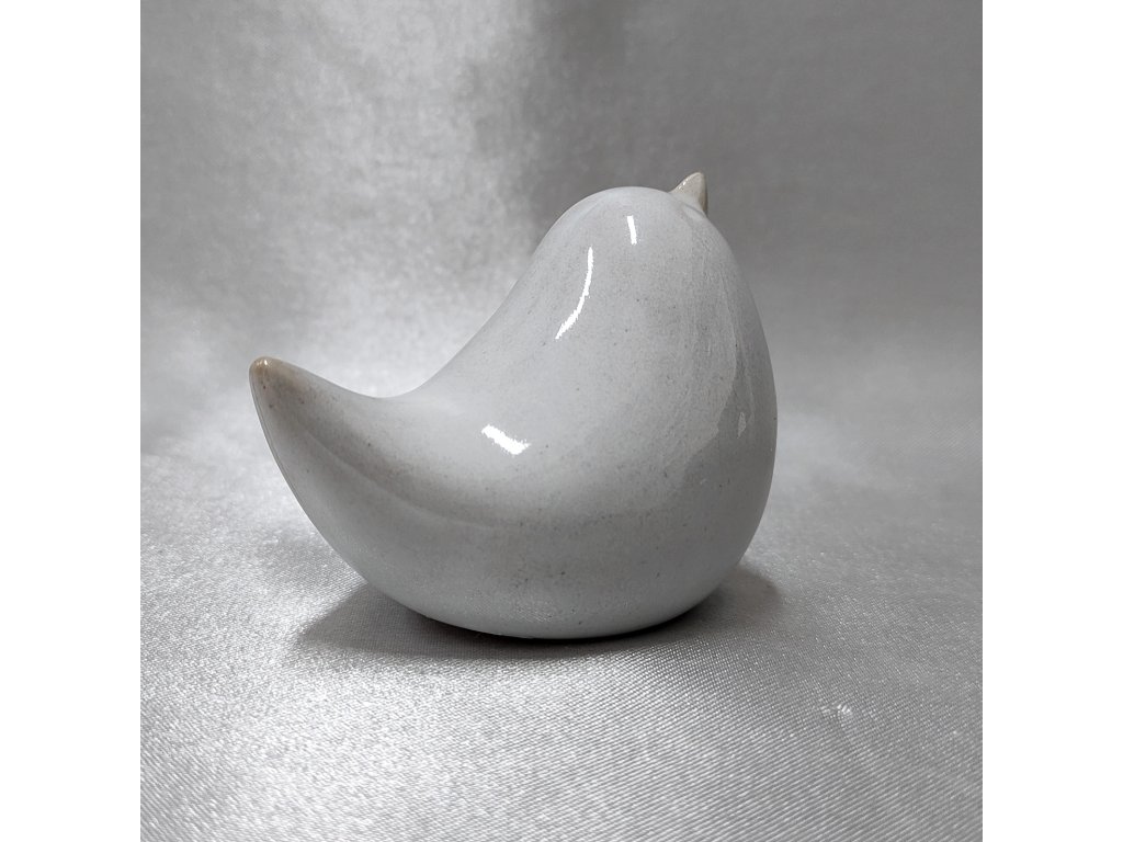 Minimalistická dekorační figurka ptáčka z lesklé keramiky s jemnou šedobílou glazurou a hladkým moderním designem.