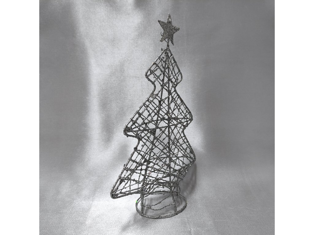 Vánoční dekorace ve tvaru stromku z jemného drátku, který je obaleného ve stříbřitých glitrech.