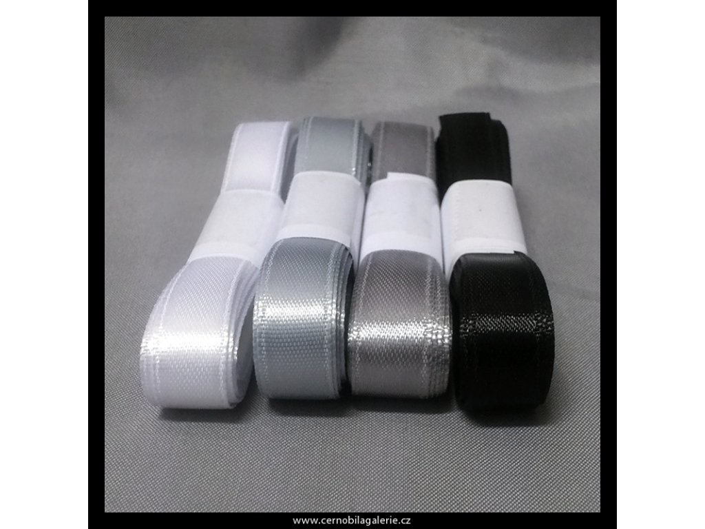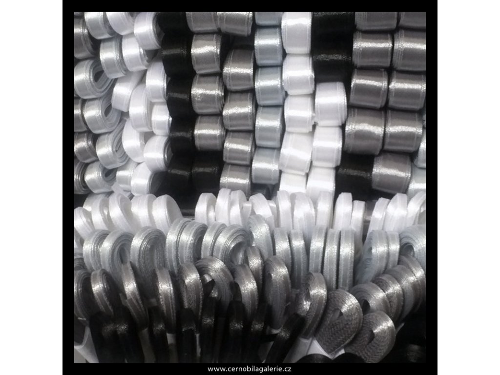 Látková atlasová stuha světle šedá s kovovým nádechem do stříbrna, je z líce lesklá a z rubu matná, používá se k dekoračním účelům, zejména k balení dárků a do aranží květinových vazeb. Stuhy nejsou určeny pro zdobení oděvů a věcí, které se běžně perou v pračce, mohou pouštět barvu. Nejsou určeny k žehlení, barvení, ručnímu praní ani pro praní v automatických pračkách.