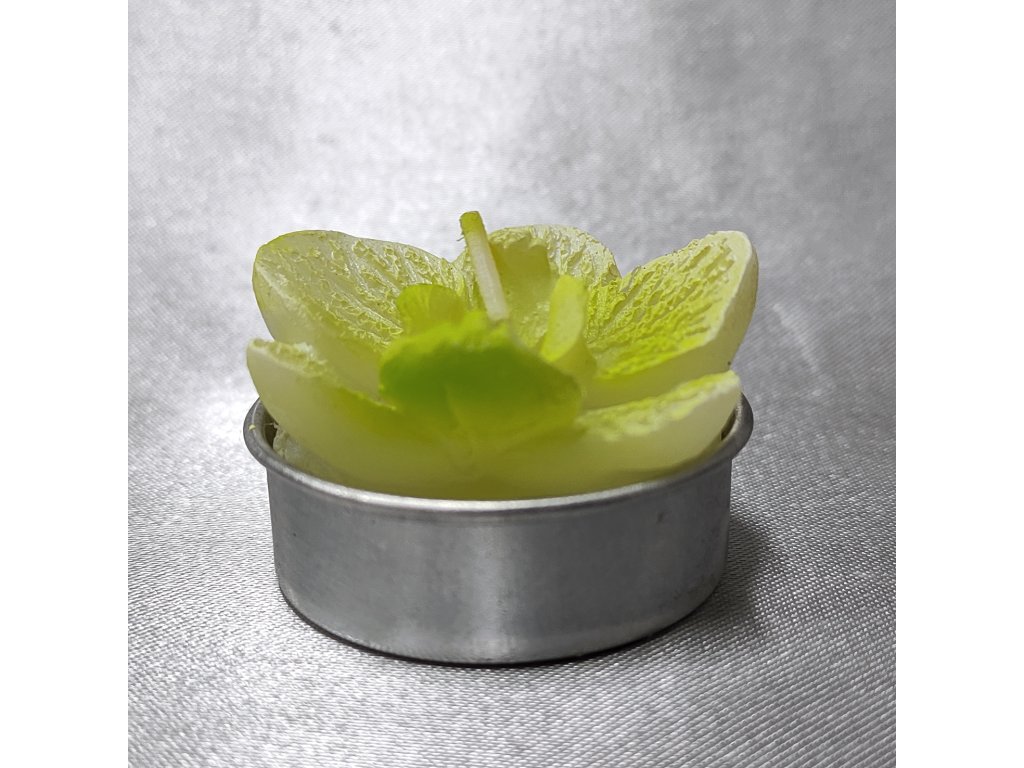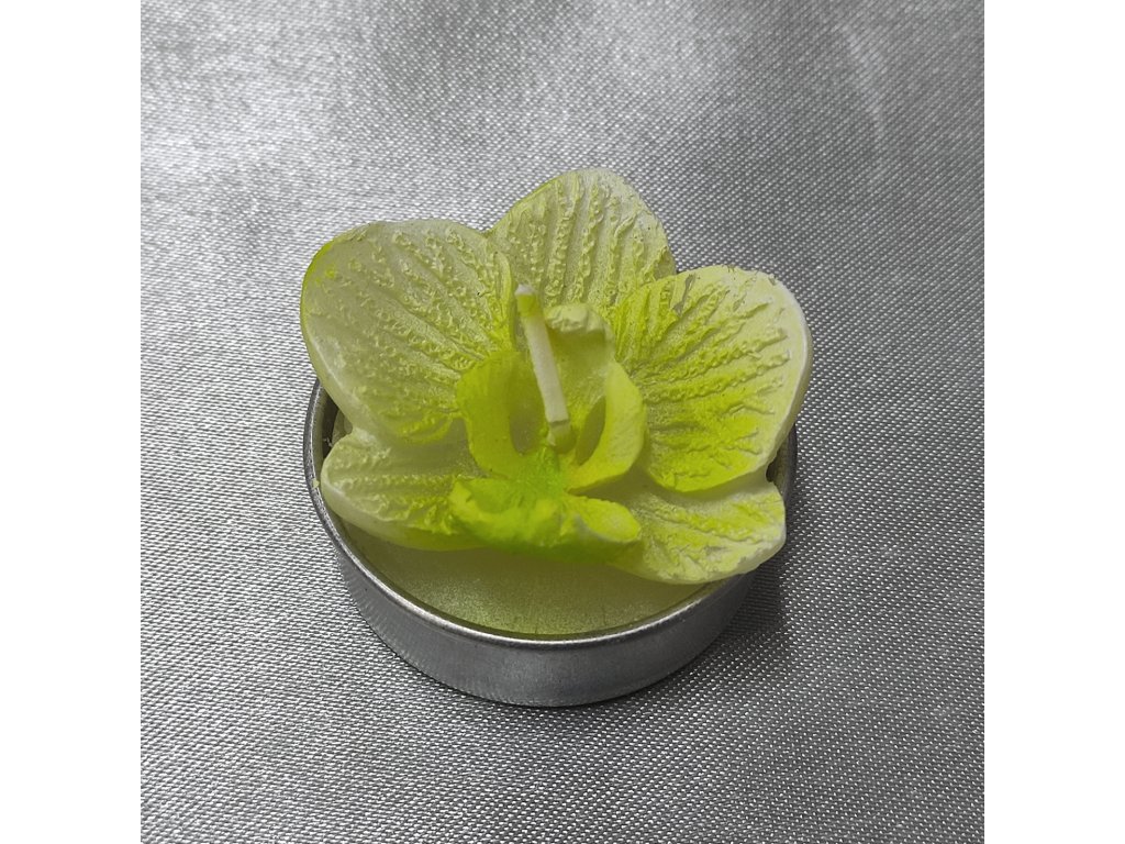 Jako drobný dárek i dekorace poslouží tato čajová svíčka ve tvaru květu můrovce (Orchidea Phalaenopsis) ve žlutozeleném vybarvení.
