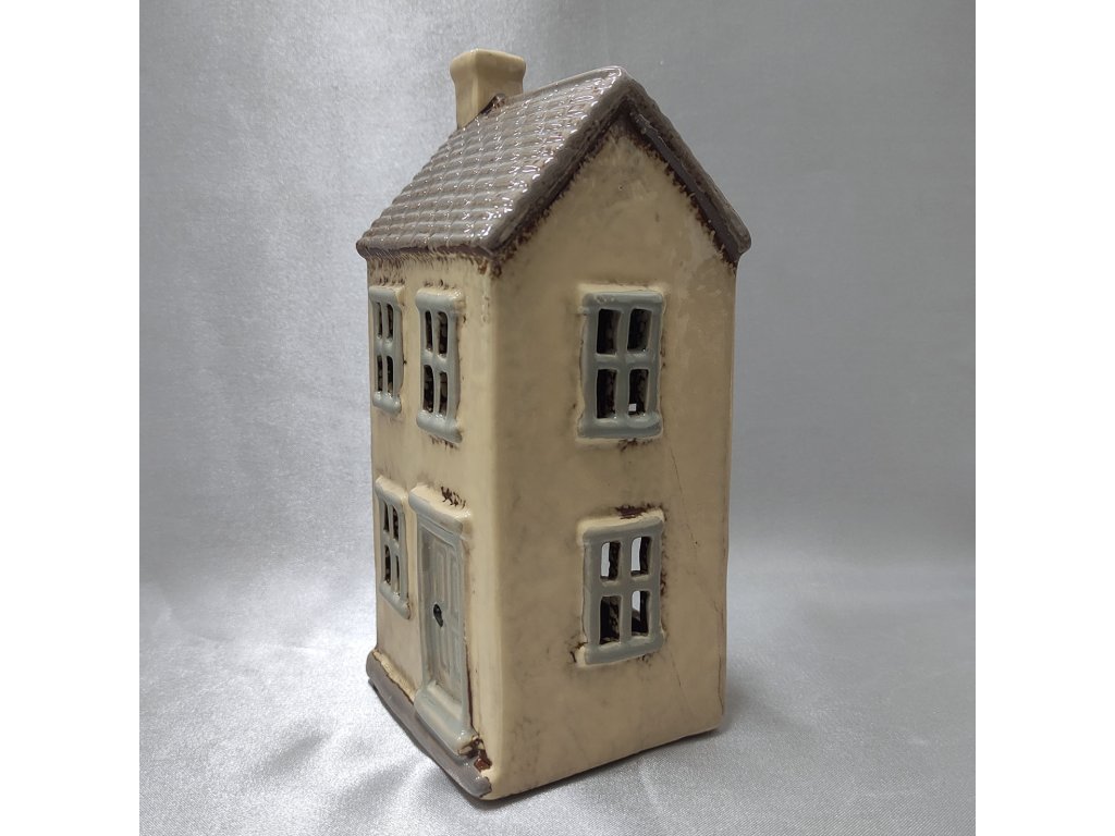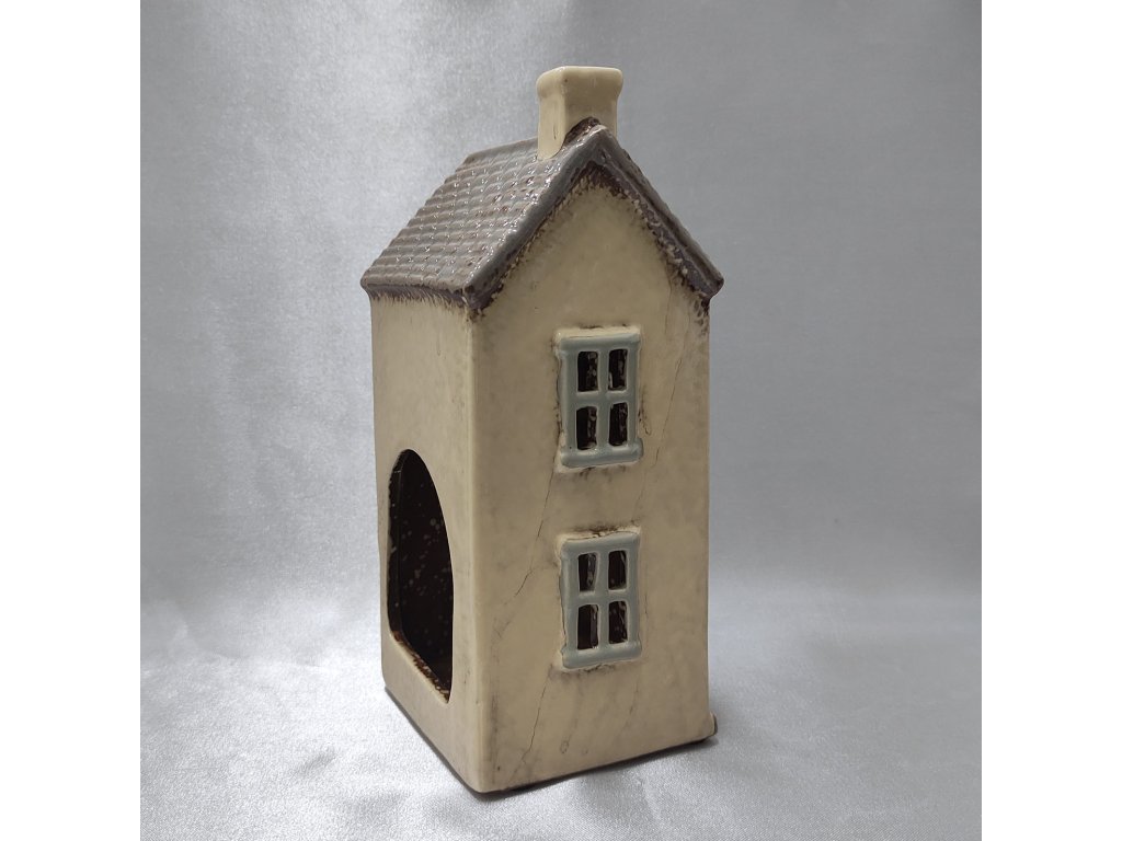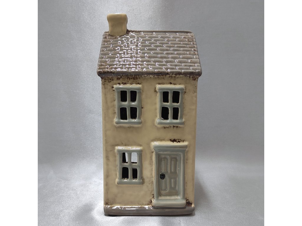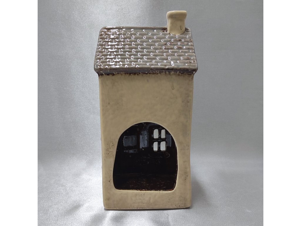 Keramický svícen v podobě jednopatrového domku s okrovou fasádou, okny a dveřmi v šedé barvě a komínem vlevo na střeše, je krásnou funkční dekorací pro radost i útulný domov.